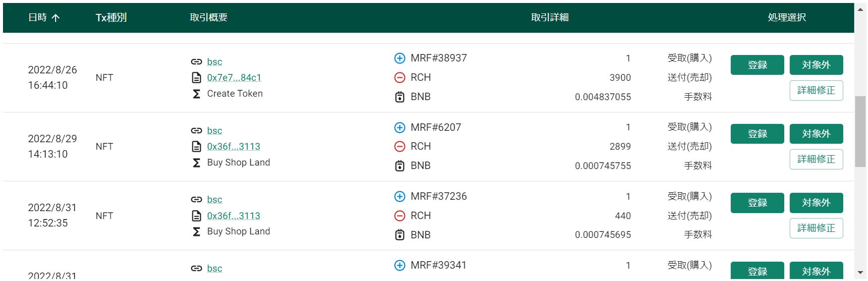 NFTの売買を行った場合には以下のように情報が整理されます。「登録」をクリックすると、NFT取引の画面にて売買したNFTの情報が生成されます。