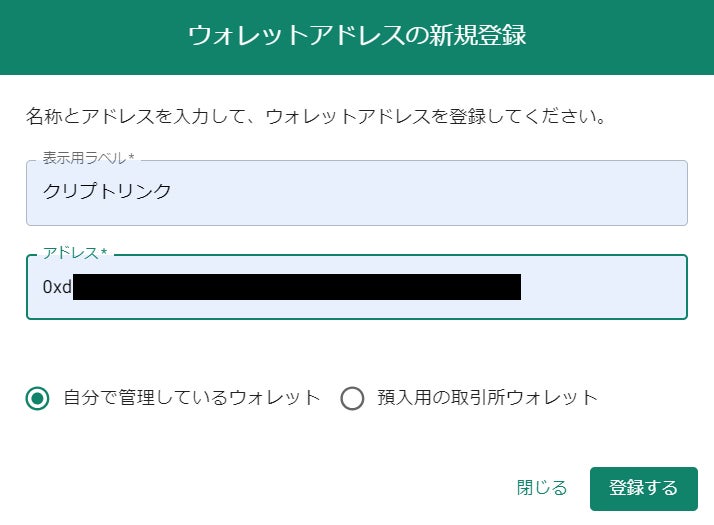 ウォレットアドレスをご登録いただくと、ご自身のアドレスとして情報が登録されます。