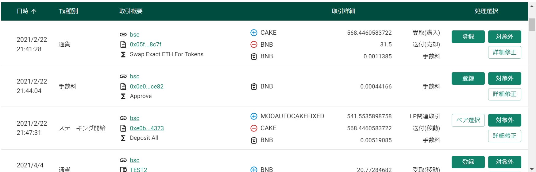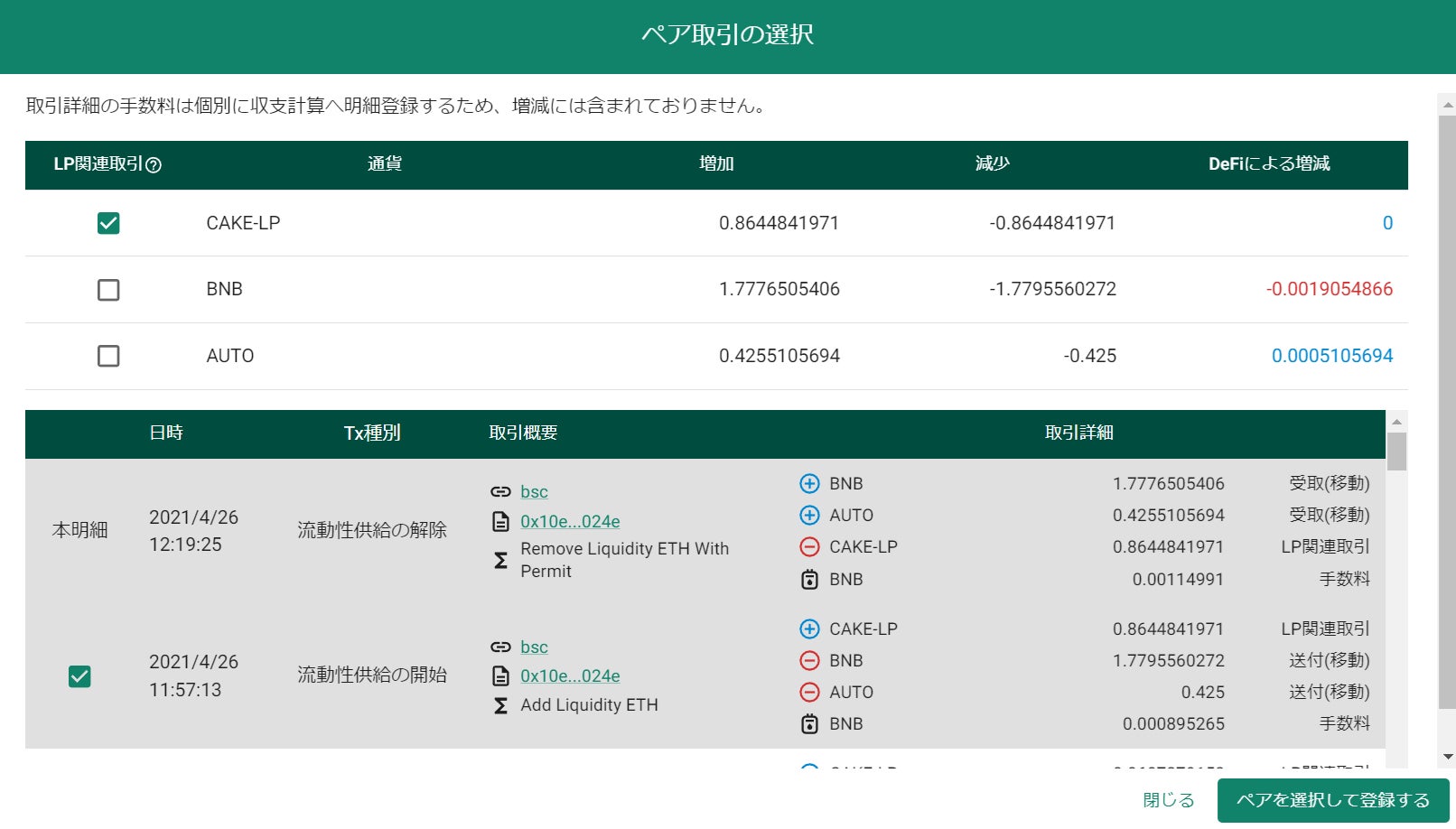 流動性供給の開始と解除のペアを作成し「ペアを選択して登録する」をクリックすると、現物取引の画面にて明細が生成されます。