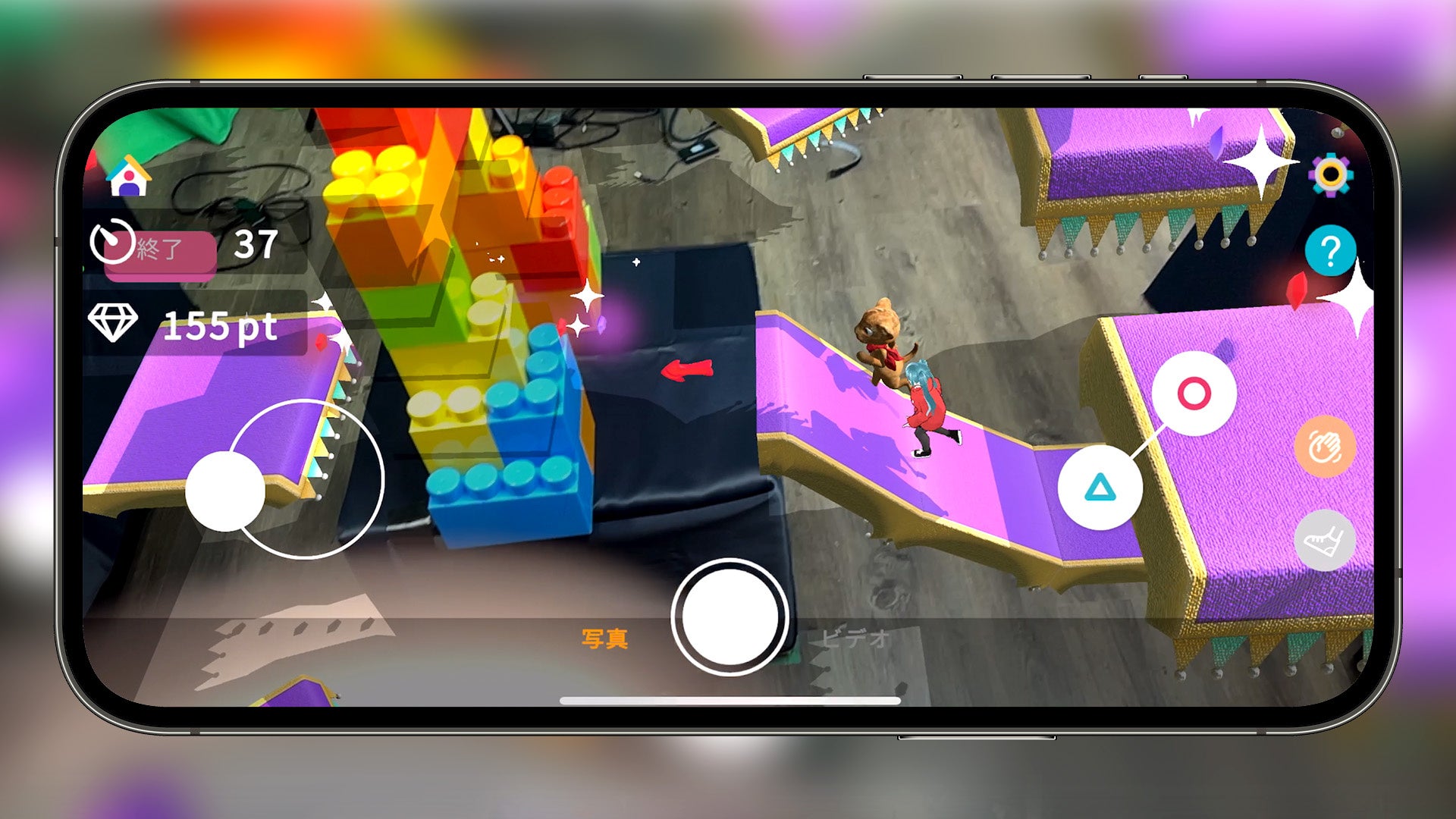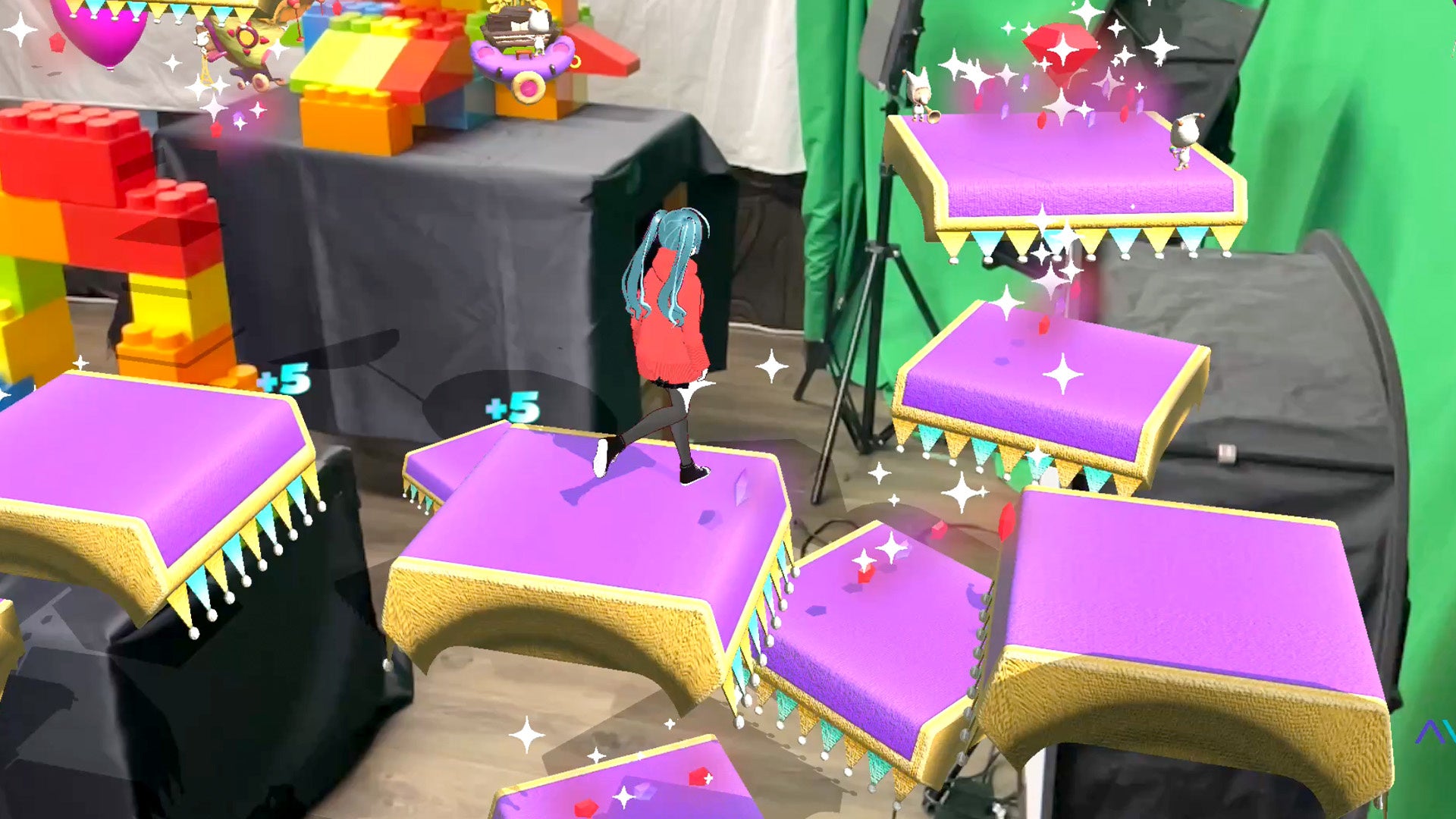 XR Kaigi 2023の展示会場ではブースにおもちゃのブロックを設置してフィールドを構成していますが、展開する際には実際にその場所にある家具などの凸凹を生かしてフィールドやクリスタルを再構成することが可能です。