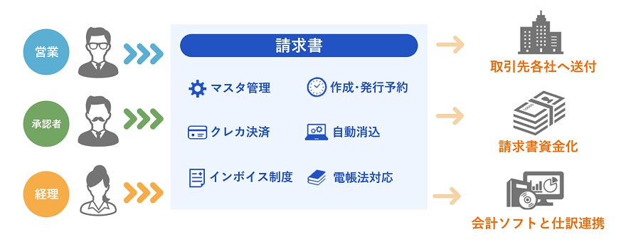 「請求QUICK」は、Webブラウザで利用できるクラウド型請求書発行システムです。請求書をWeb上で作成・承認・発行できることに加え、全国の金融機関と連携することで入金消込の手間を大幅に軽減することを実現しています。さらに、会計ソフトと連携することで、請求書発行にかかる社内の業務フローを明確にし、請求書の発行から消込、会計処理までの作業を効率化することができます。