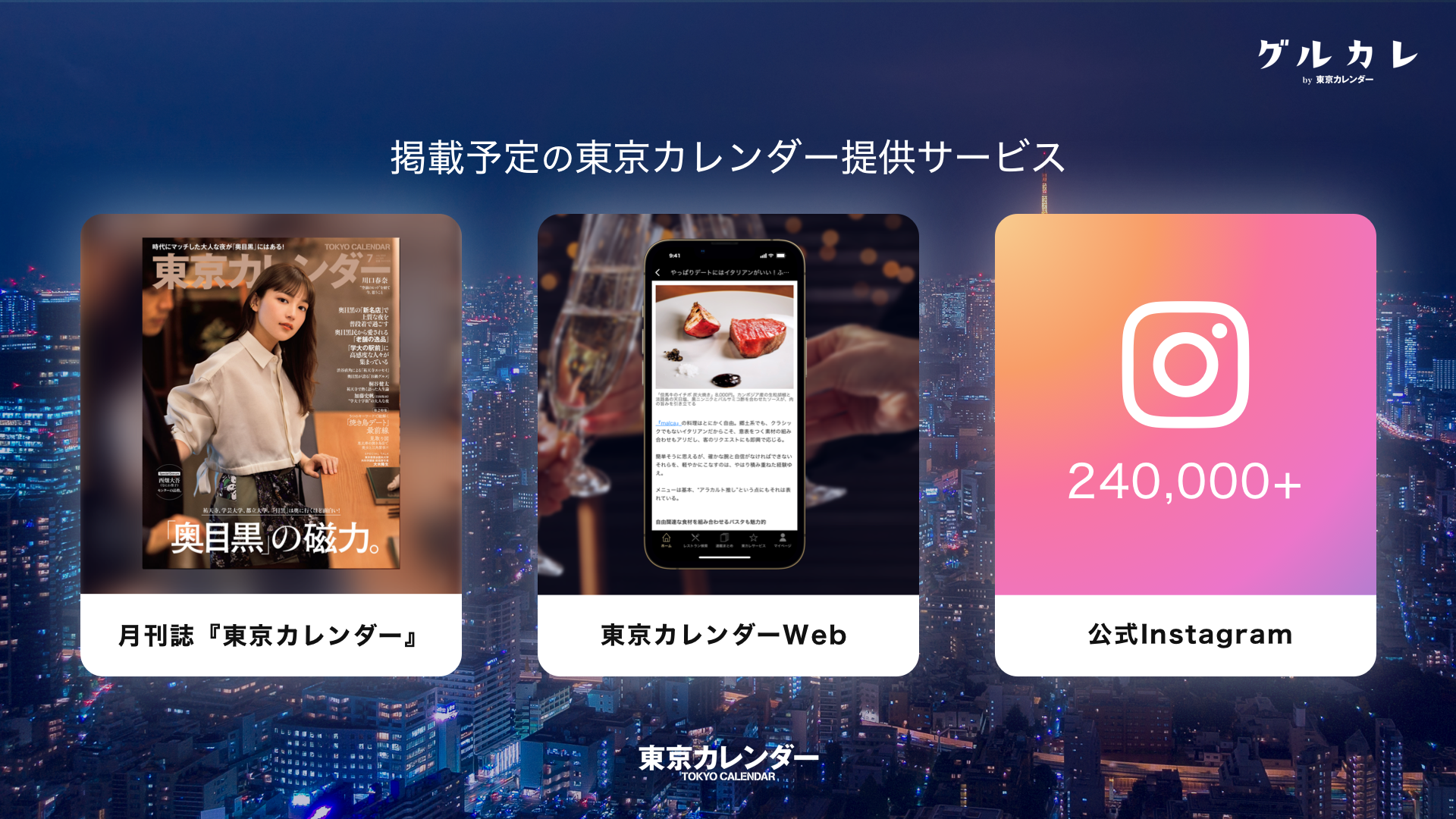 この度、より多くの方に、魅力に溢れた街「東京」のグルメ情報を見つけワンランク上の食体験を通じた艶やかな人生をお楽しみいただけるよう、ユーザー投稿によるレストラン情報と徹底した取材に基づくレストラン紹介コンテンツからレストランを探し、予約ができるサービスとして「グルカレ by 東京カレンダー」をリリースしました。