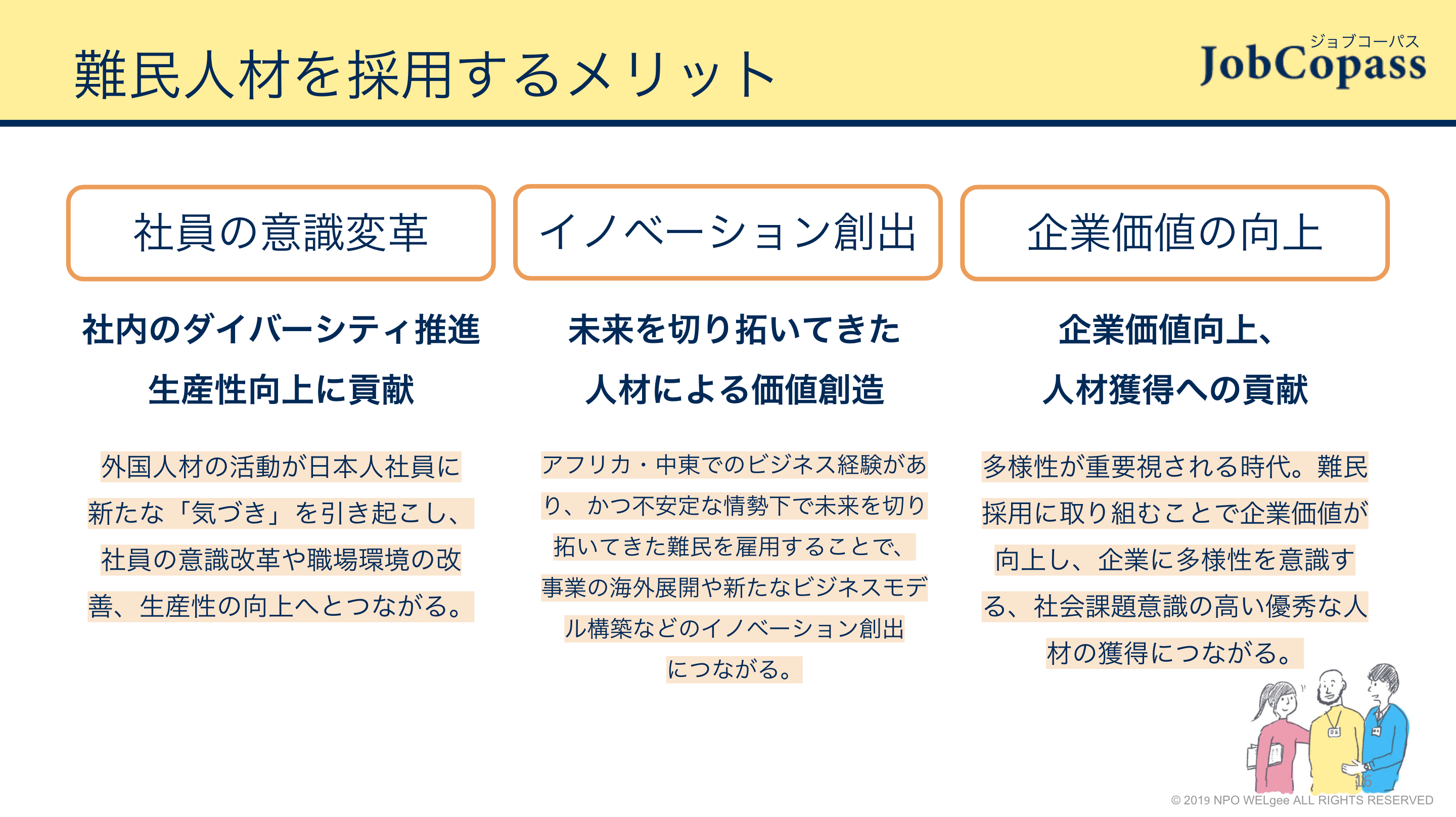 難民が生じる背景や社会情勢が多様化・複雑化する中で、従来の難民受け入れだけでは解決策とならない状況があります。WELgeeは彼らを「難民」としてのみではなく、「社会に新しくやってきた人」としての受け入れの1つの方法として「人材」と捉えています。
