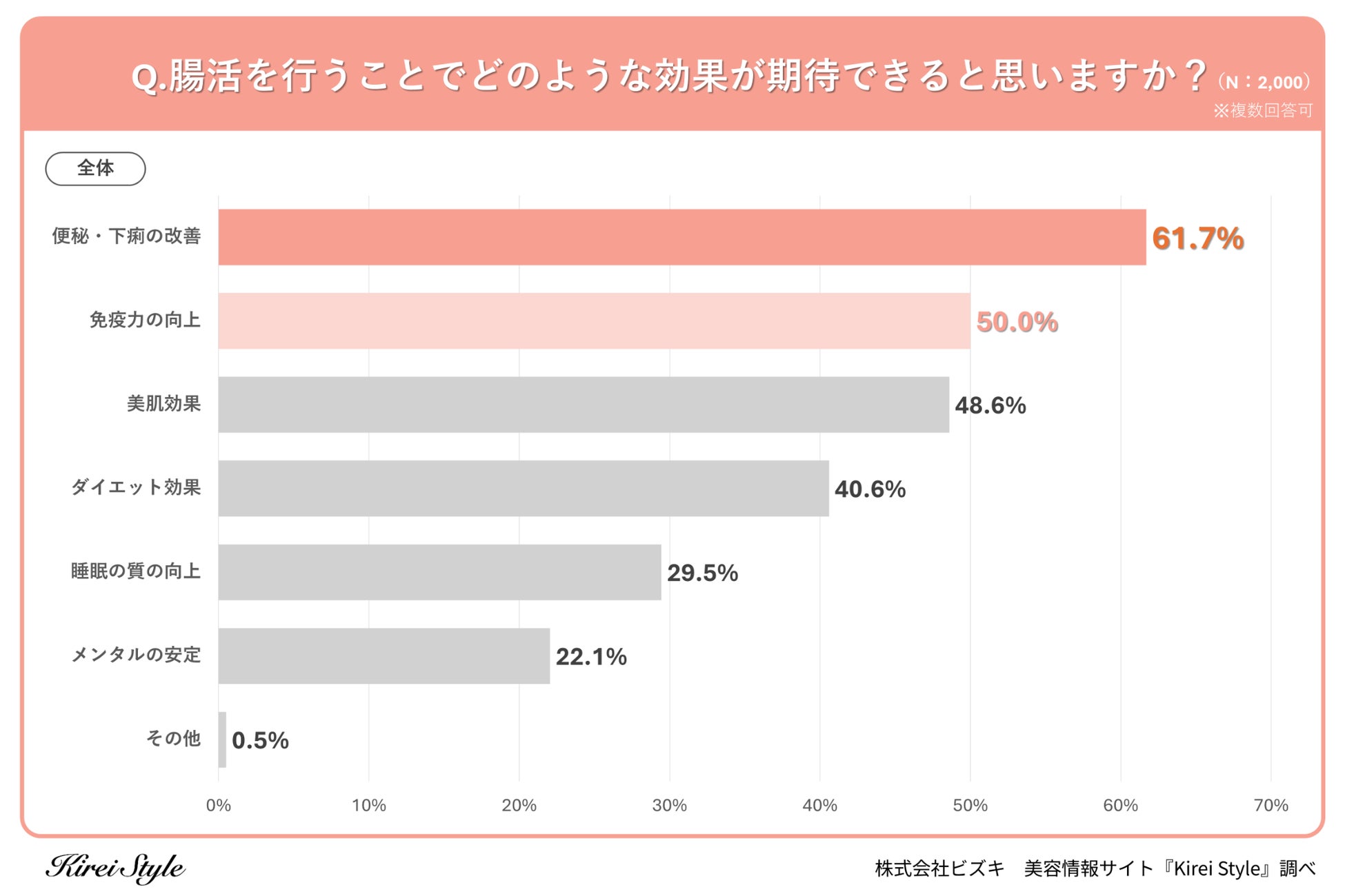 全国の20代~50代の女性を対象に、「腸活を行うことでどのような効果が期待できると思いますか?」というアンケートを実施したところ、最も多かった回答は「便秘・下痢の改善」で61.7%となりました。次いで、「免疫力の向上」が50.0%、「美肌効果」が48.6%と続く結果となりました。