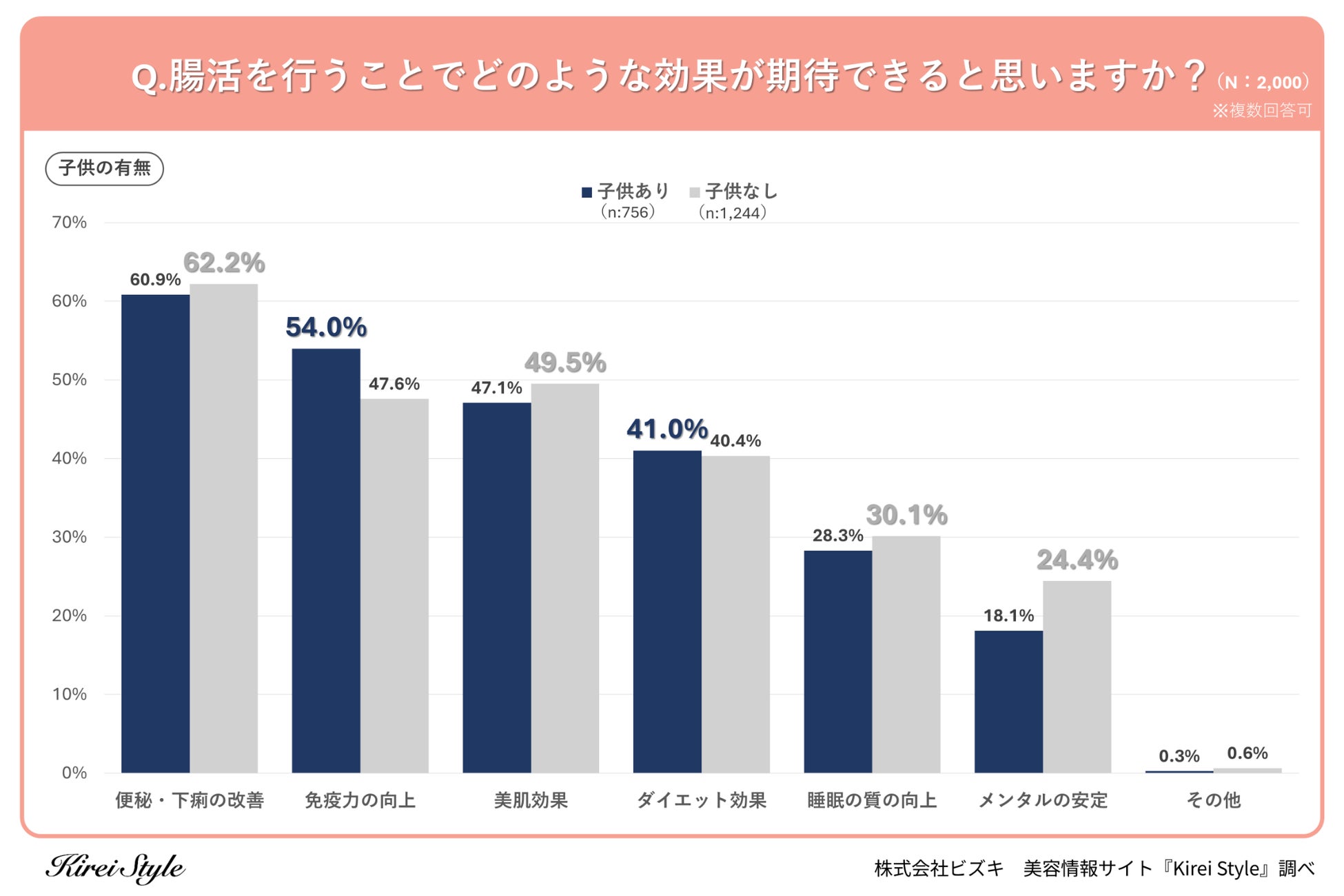 子供の有無で見ると、「免疫力向上」と「ダイエット効果」で「子供あり」の回答が上回りました。子供がいると保育園や幼稚園、学校や習い事などで風邪をもらってくる機会が増えるため、感染を防ぐために日頃から免疫力を高める行動を意識しているのかもしれません。また、妊娠や出産を経験した女性はホルモンバランスの変化により体型の変化を感じやすくなっている可能性があり、ダイエット効果への期待も大きいようです。