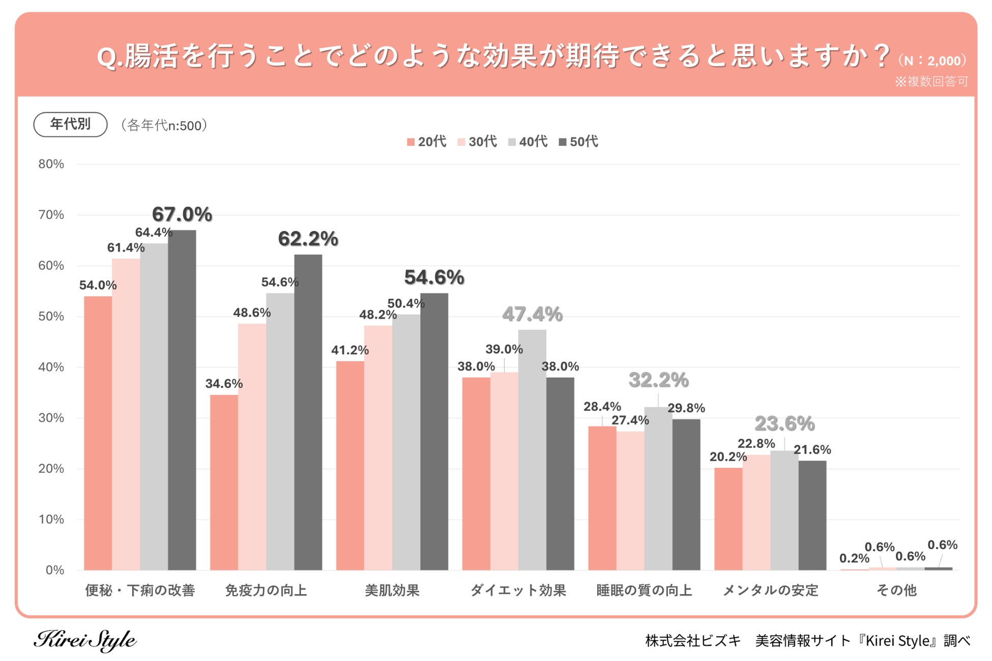 年代別に見ると、どの年代でも半数以上が「便秘・下痢の改善」を期待効果として挙げており、”腸活”という名前からイメージしやすい効果であることが伺えます。また、実際に取り組んだことがある人が、その効果として実感しているということなのかもしれません。特に40代と50代で回答率が高くなりましたが、年齢の変化によるホルモンバランスや体の不調を感じている方が多く、腸活への関心も高まっている可能性が伺えます。