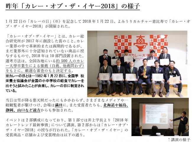 昨年も、「カレーの日」を記念して2018年1月22日、よみうりカルチャー恵比寿で「カレー・オブ・ザ・イヤー2018」が開催されました。