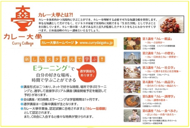 カレーを体系的かつ実践的に学ぶことができ、カレーを理解する必要不可欠な知識全般を習得します。単なる知識としてだけでなく、ビジネスや家庭で実用的に実践できる「生きた学問」として学ぶことを目指しています。カレー界の第一人者である井上岳久が監修したテキストをもとに分かりやすく学べます。日本最高峰のカレー講座といえるでしょう。