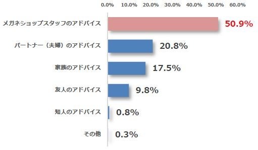 誰のアドバイスをもっとも必要と感じているか質問したところ、最多回答は「メガネショップスタッフのアドバイス(50.9%)」、次に「パートナー(夫婦)のアドバイス(20.8%)」、「家族のアドバイス(17.5%)」と続きました。「AIフィッティングミラー」をきっかけに、メガネショップスタッフにもアドバイスも聞いてみてはいかがでしょうか。