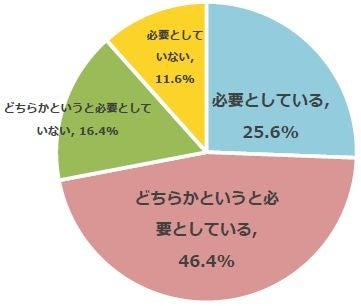 自身でメガネを選び、購入していると回答した554名を対象に、メガネを選ぶ際、アドバイスを必要としているか質問をしたところ、72.0%が「必要としている」(必要としている:25.6%、どちらかというと必要としている:46.4%)と回答しました。メガネの似合い度を点数評価する「AIフィッティングミラー」を、メガネ選びのアドバイスの一つとしてご活用ください。