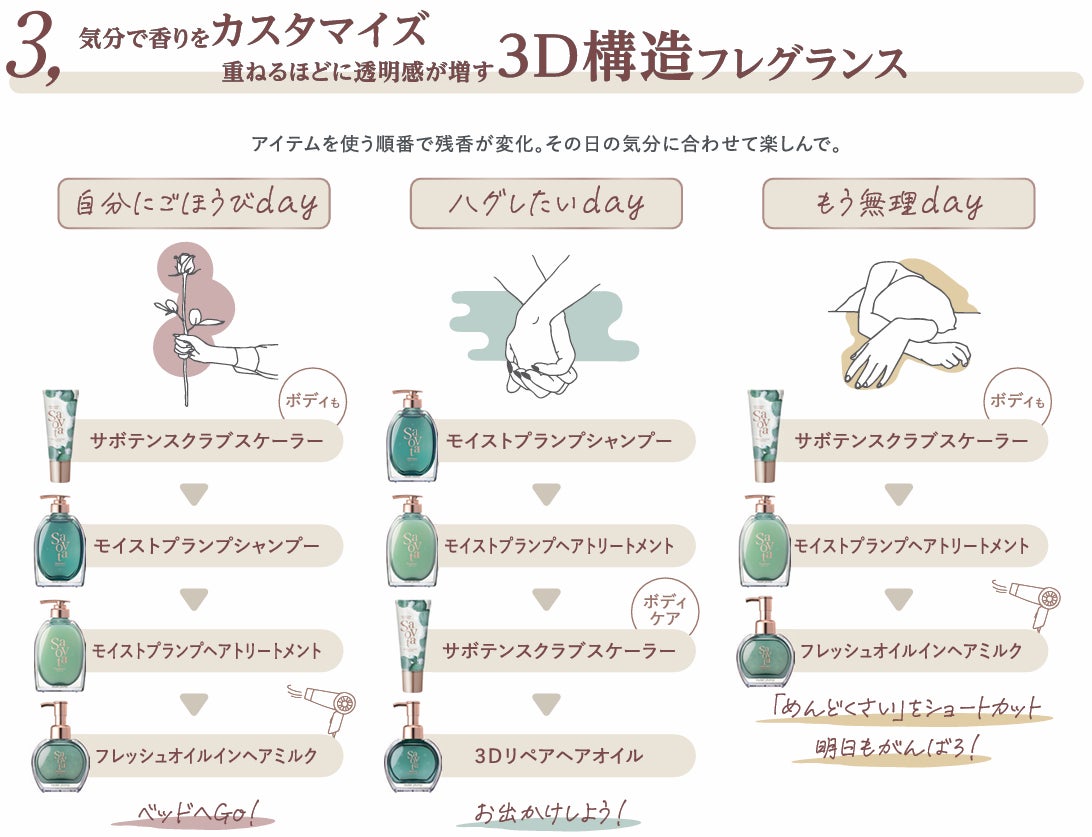 重ねるほどに透明感が増す 3D構造フレグランス – 気分で香りをカスタマイズ。アイテムを使う順番でも残香が変化。その日の気分に合わせてお楽しみいただけます。