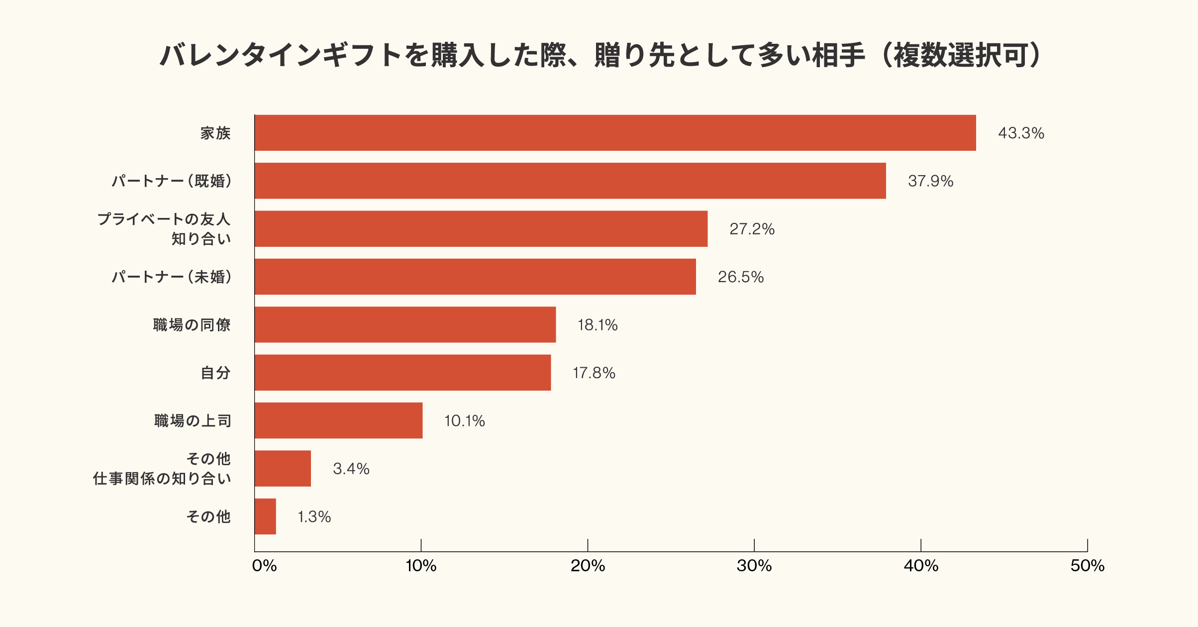 「バレンタインギフトを購入した際、誰に贈ることが多いですか?」という設問では「家族」「パートナー(既婚)」がそれ以外の選択肢に10%以上の差を付けて回答を集めており、「既に関係性が構築されている家庭内」へ贈りものをすることが多いという結果になりました。