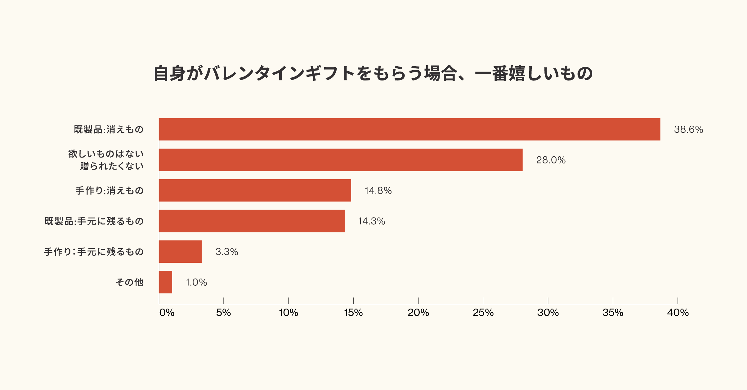 気持ちの表現として嬉しいと感じる方もいる一方、場合により負担にも成り得てしまう「手作り」に代わり、もらって嬉しいものとして回答を多く集めたのは「既製品・消えもの」でした。アンケートでは「(食べ物の場合)他人が作ったものを食べることに抵抗がある」という精神的・衛生的な観点でのコメントも寄せられており、お相手をよく知らない場合など既製品での贈りものが推奨される場面もありました。
