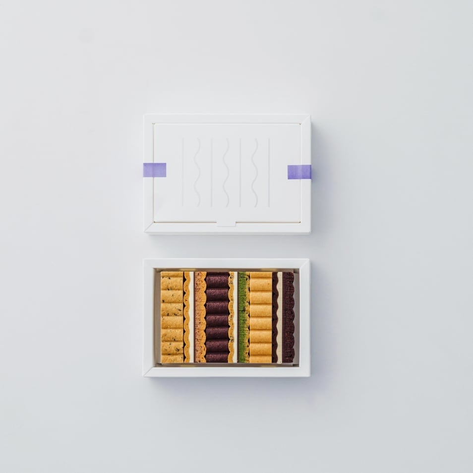 「情景を、形状に」する京都発祥のブランド「RAU」で人気のチュイールサンドは、シェフパティシエールがフランスを訪れた際に見た瓦屋根と、京都の瓦屋根をモチーフにデザインされており、軽やかなクリームと板チョコレートを波型のクッキーで挟んでいます。