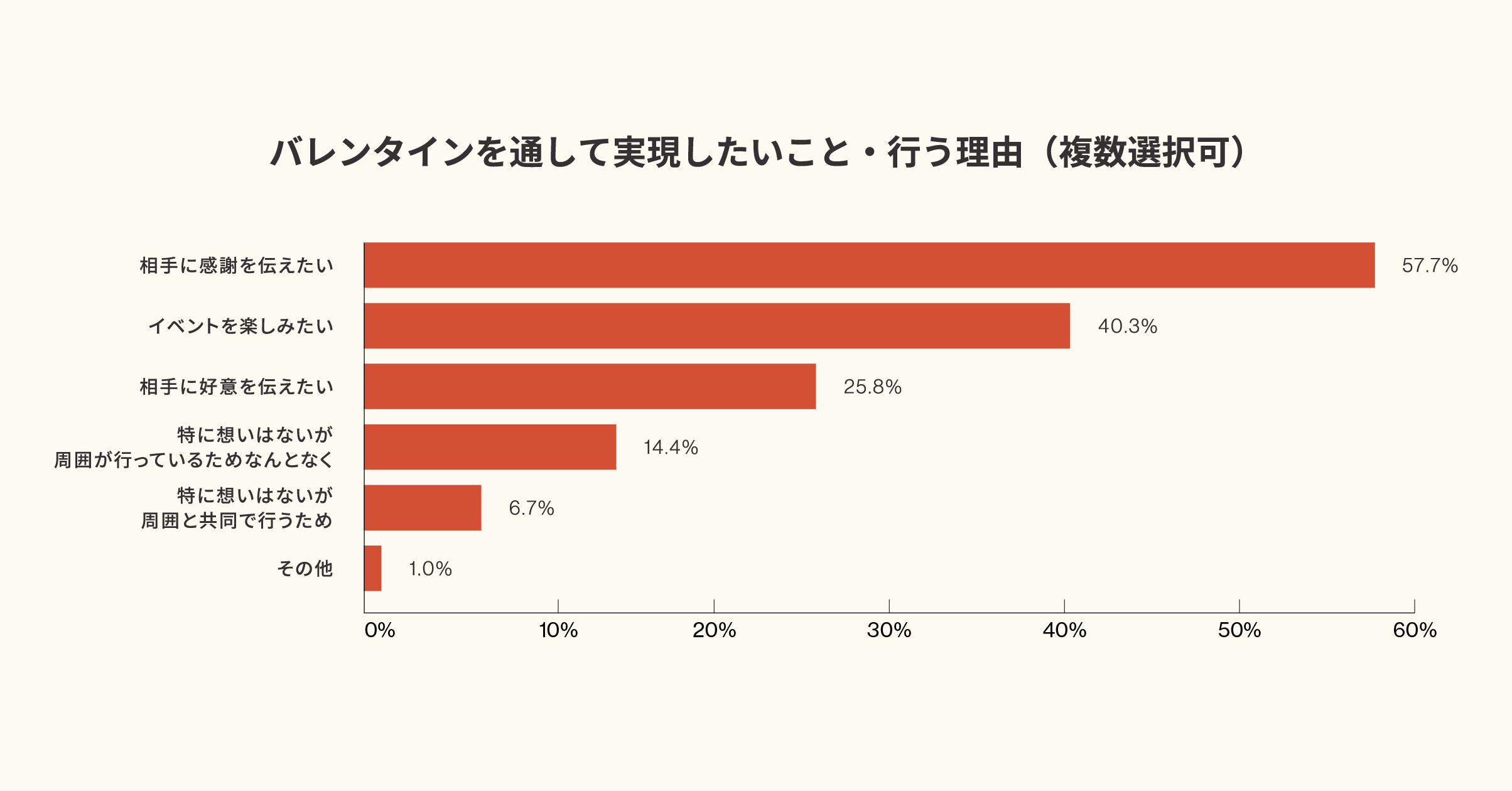 イベントに消極的であるコメントのうち、多くは「職場・学校で行われる義理的な贈りものへの対応が大変・不要に感じる」という趣旨ものであり、特に感謝を伝えたい気持ちが強く、気を遣わない家庭内へ回答が集中したこととも傾向が沿っています。一部の環境で「習慣・義理」としての贈りもの文化は残るものの、現在では「周囲が行っているためなんとなく行う」「周囲と共同で行っているため行っている」といった環境に依存した理由でバレンタインギフトを贈る方は少なく、「気持ちを伝えたい」「イベントを楽しみたい」という合理的な動機で行われる方が多いようです。