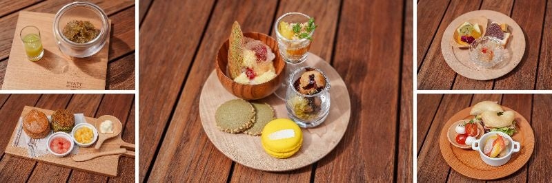 1 段⽬には、パイナップルとマンゴーをざくざくとした食感が特徴のクランブルと共にお召し上がりいただく「トロピカルパフェ」、バナナジャムとピスタチオの濃厚な味わいと軽やかなシュー生地との対比が楽しい「プロフィットロール」、レモンクリームとオレンジのコンフィチュールを挟んだ「柑橘マカロン」、アーモンドの食感と抹茶の香りとのベストマッチを楽しむ「抹茶クッキー」、そして桃のコンポート、生クリーム、赤い実(ラズベリー&苺)のジャムが絶妙なハーモニーを奏でる「ピーチメルバ」の4種のスイーツが登場。2 段⽬には「季節のフルーツ」、シナモンやオールスパイスを入れたスパイシーな生地を湯煎焼きでしっとりと仕上げた「チーズテリーヌ」、そして小田原産の曽我梅を使用した「曽我梅のゼリー」をご用意。「曽我梅のゼリー」は、ゼリーの上から梅ソースをかけ、フリーズドライの苺をトップに散りばめた「酸味を存分に楽しむ」爽やかな一品です。また、 3 段⽬には、ケージフリーの平飼い鶏の卵を使用した「たまごとベーコンのベーグルサンド」、旬を迎えるトマトの酸味と甘みを楽しむ「トマトとモッツァレラのカプレーゼ」、新鮮な⿂を使った「エスカベッシュ」の3種のセイボリーをご用意いたしました。