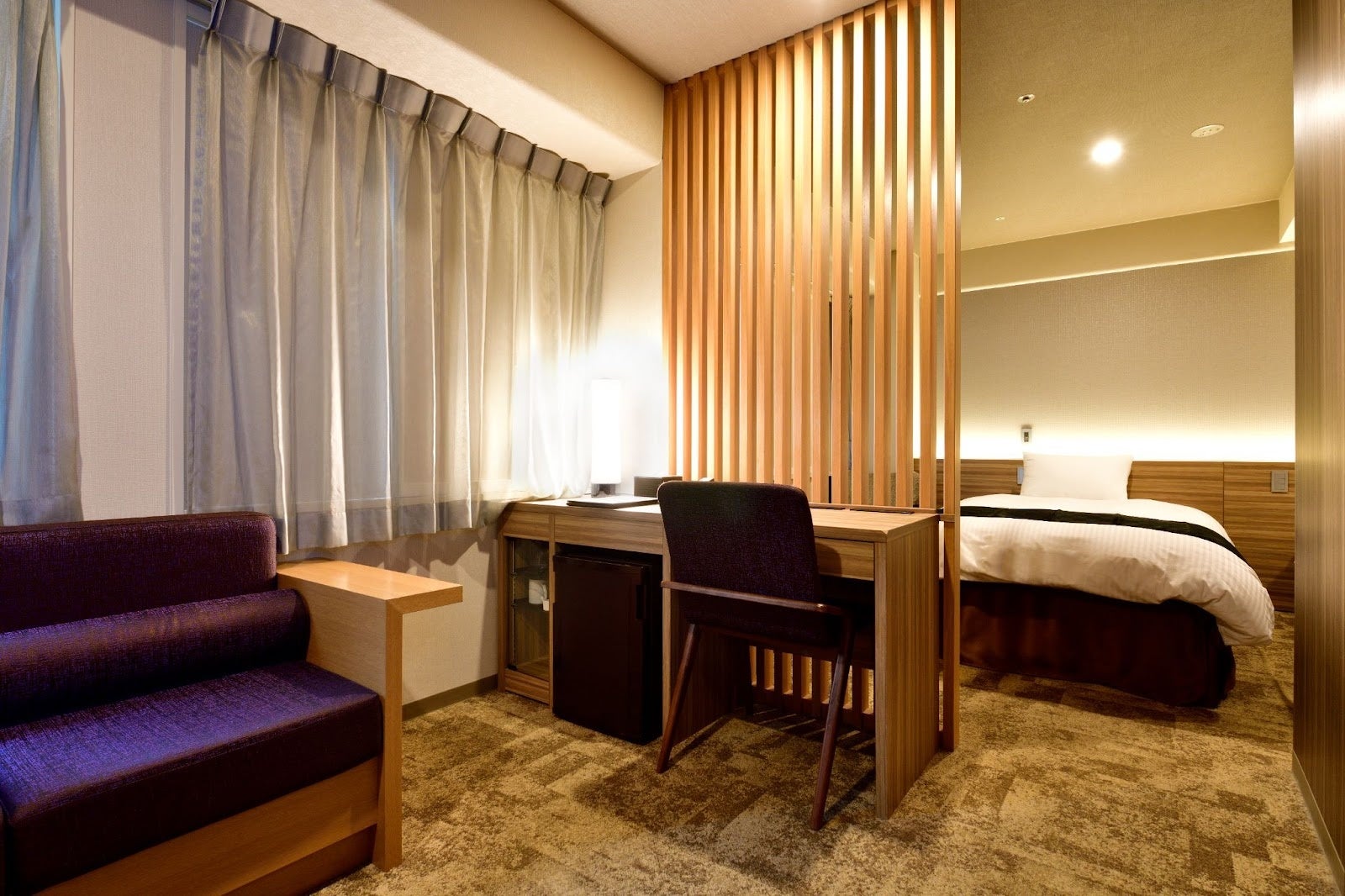 京都駅八条東口より徒歩2 分のホテル エルシエント京都。デラックスツインでは、ベッドルームとリビングスペースが備わっています。