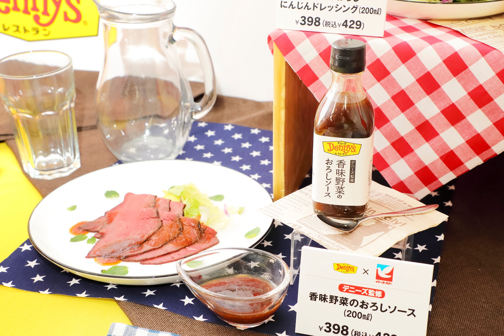 続いて五品目の「デニーズ監修 香味野菜のおろしソース200ml 」では、「野菜と果物をしっかり煮出して製造しており、ハンバーグやステーキといった肉商品にあう味わいに仕上がった」と説明しました。