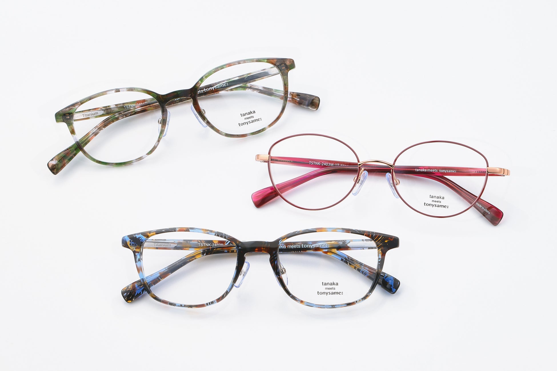 「tanaka meets tonysame:」は、かけ心地の良さと高いデザイン性で人気のアイウェアブランド「tonysame:」と、メガネの田中のコラボシリーズで、今回は第2弾です。ユニセックスでかけていただけるセルフレーム2型、レディース向けのメタルフレーム1型、各3色 計9モデル(税込29,700円、レンズ別売)をメガネの田中チェーン全店とウェブショップで販売します。
