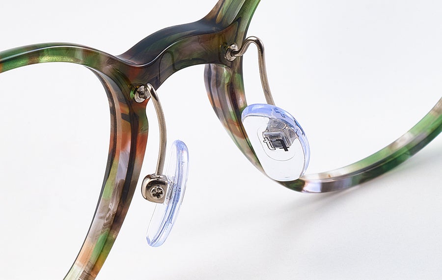 tonysame:が開発したオリジナル丁番を採用。チタンの中でも軽量で丈夫なβチタンを用いたスプリング(ばね)パーツが、かけ外しの際の負荷を吸収するので型崩れしにくく、柔らかいかけ心地が特長です。