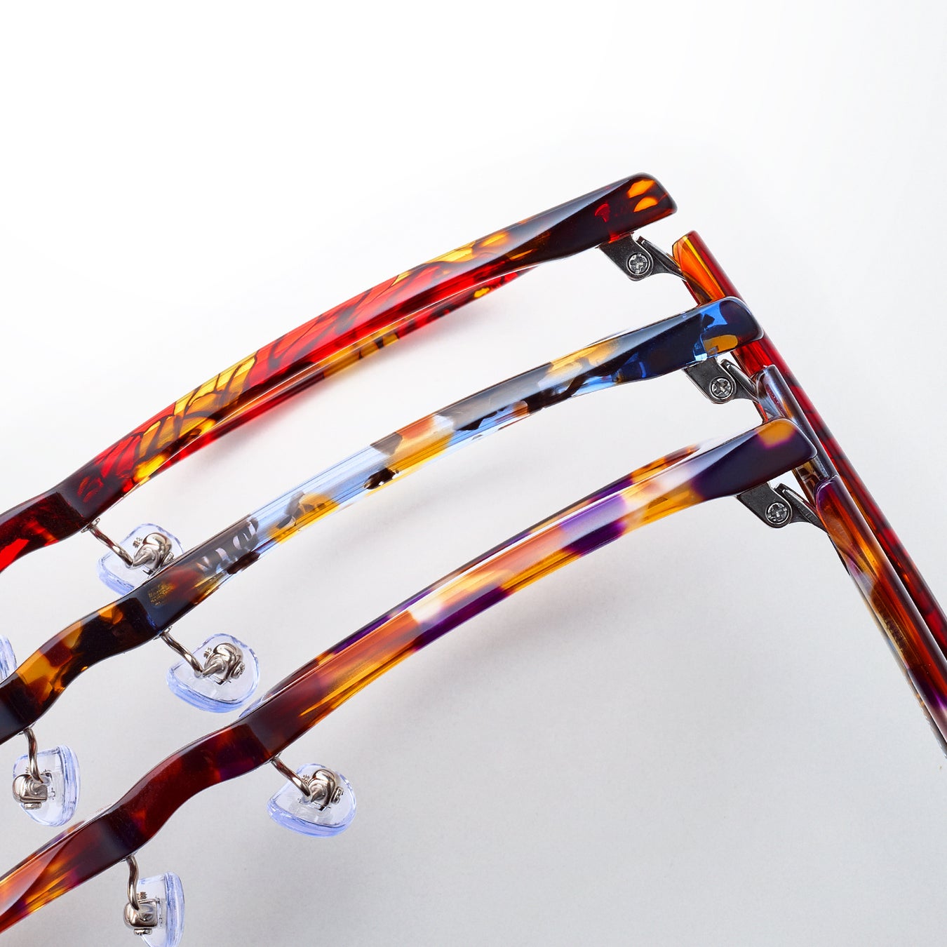 tonysame:らしさを感じる、個性的で美しいセル生地を使用。一見派手に見えますが、実際にかけてみると不思議と肌になじむ絶妙な色選びにこだわりました。
