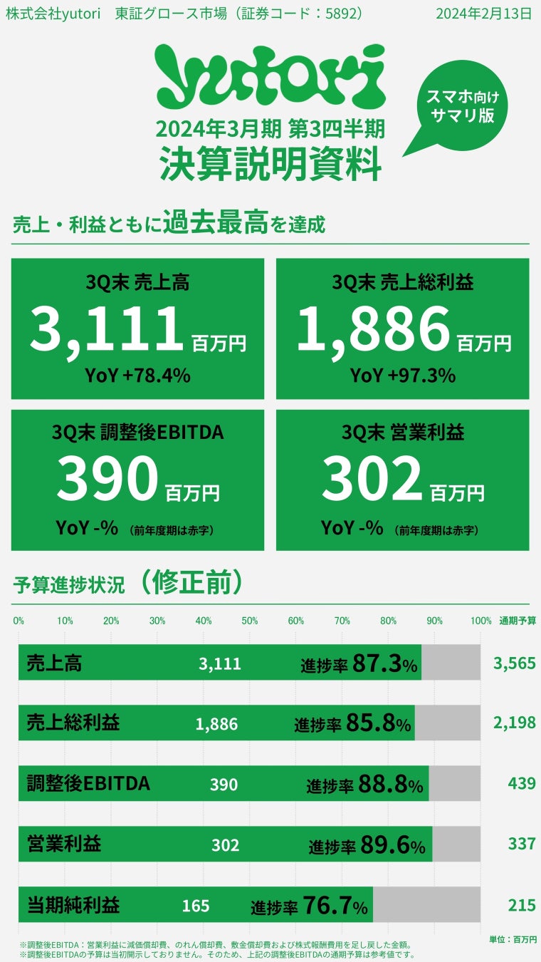 株式会社yutori 決算説明資料および説明動画の公開に関するお知らせ