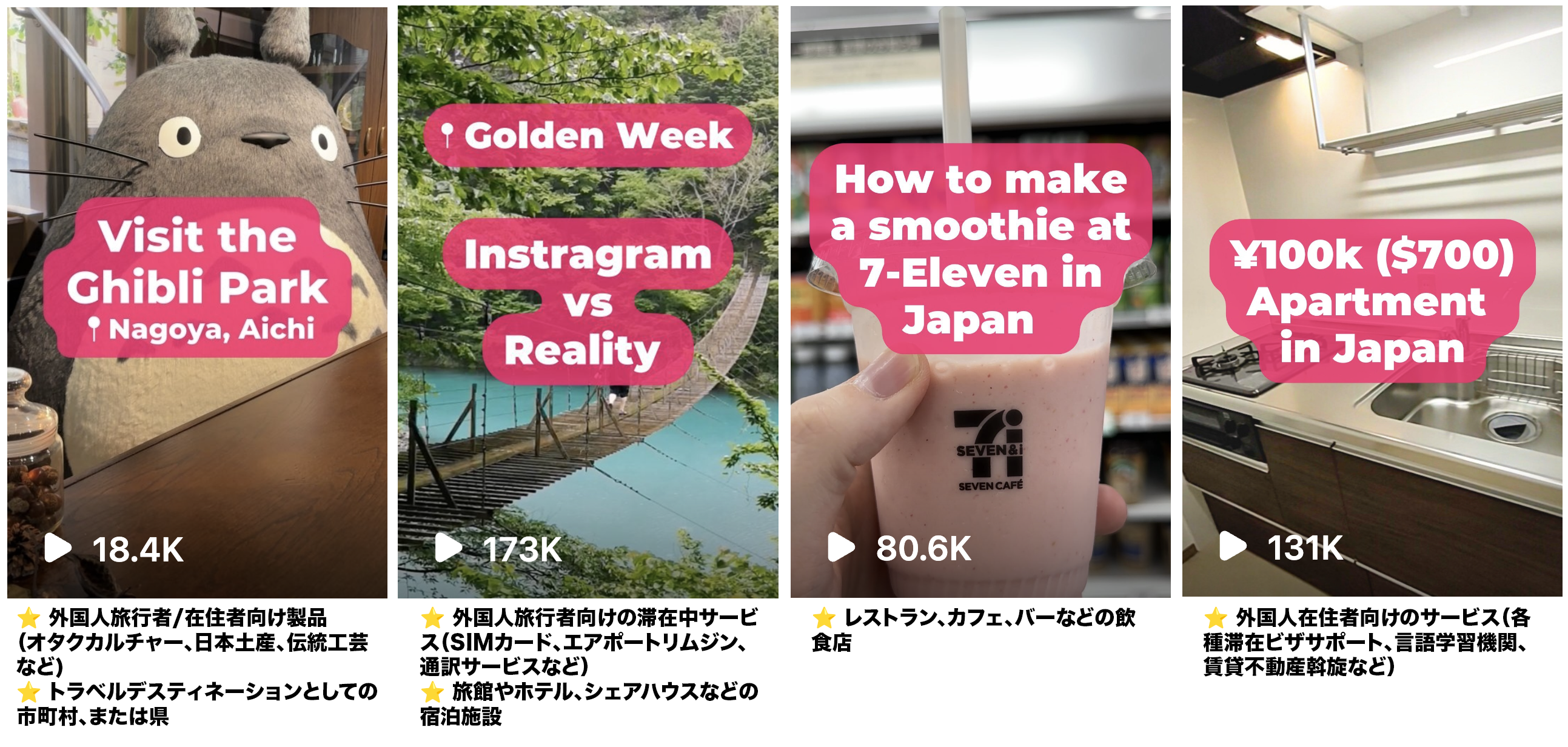 これまでに反響の多かったリール動画の例。特にユニークな内容や日本独自な文化に関連するコンテンツは広く拡散されます。画像:株式会社ジープラスメディア
