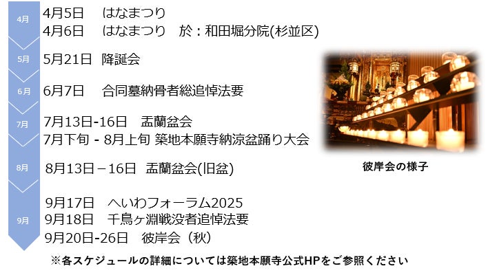 2024年度下半期(2024年9月~2025年3月)は、訪日外国人旅行者数が2024年は過去最高の約3600万人(日本政府観光局の推計値)だったこともあり、築地の街は常に大賑わいでした。おかげさまで外国人観光客を含め、築地本願寺の境内や本堂にも多数のご参拝者がお越しになりました。ここに2024年度下半期の活動報告と2025年度上半期に予定されている主な行事などをご報告いたします。
