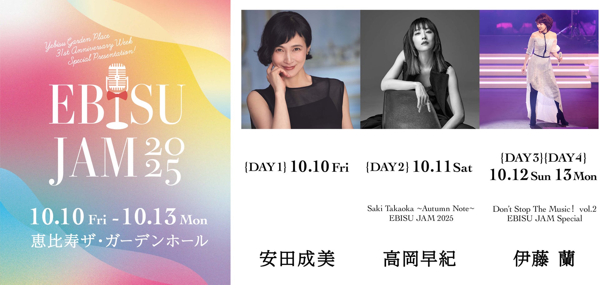 【EBISU JAM 2025】10/10(金)~13(月祝)の4days開催決定!10/10(金)安田成美、10/11(土)高岡早紀、10/12(日)&13(月祝)伊藤 蘭が出演