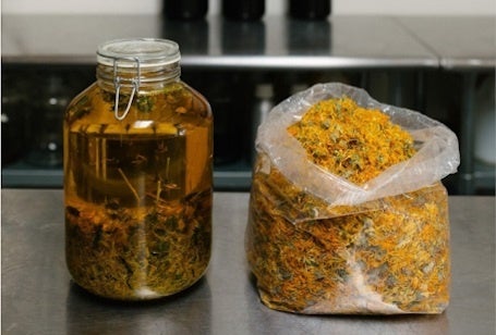 インフューズドオイル(浸出油)は、ハーブをオイルに漬けて成分を抽出したものです。[o]の植物油は、[e]の植物エキスが浸出したインフューズドオイルです。