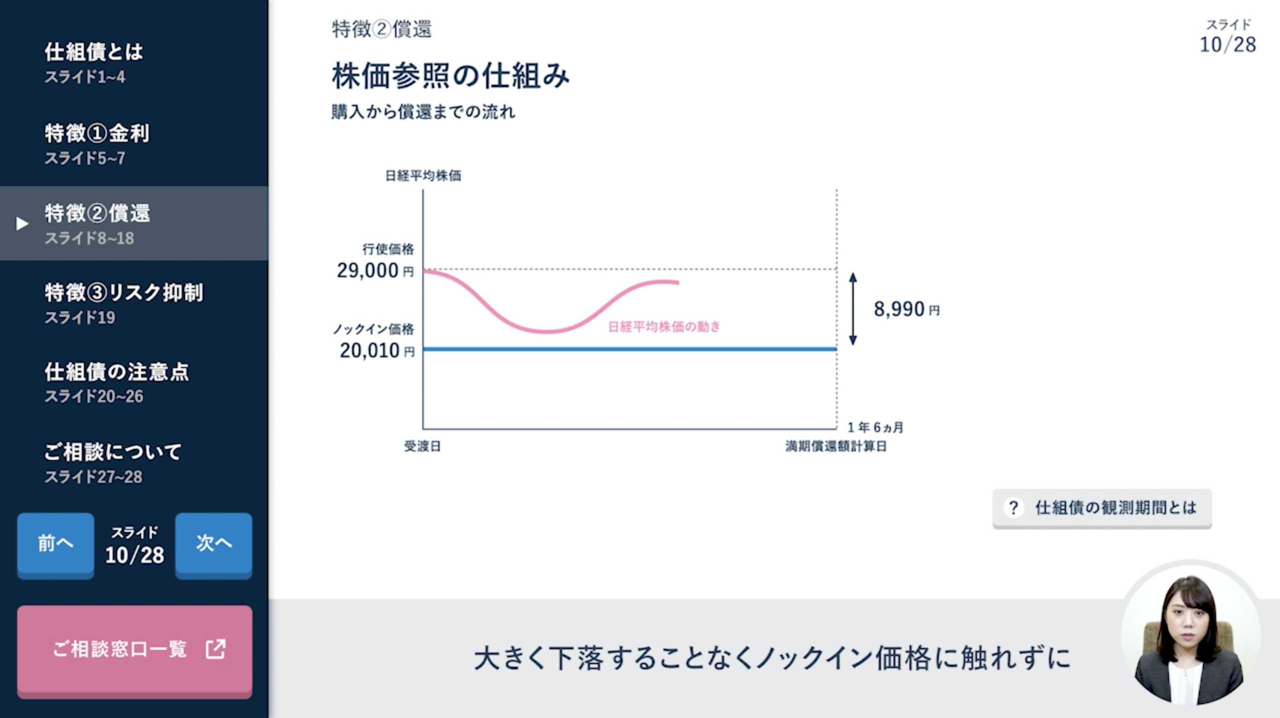 金融商品の説明動画は、店舗の営業スタッフが実際の接客と同じテンポで説明しています。対面での接客で資料を見せながら視覚的に説明している部分には、動画ではグラフとアニメーションで表現する工夫を加えています。