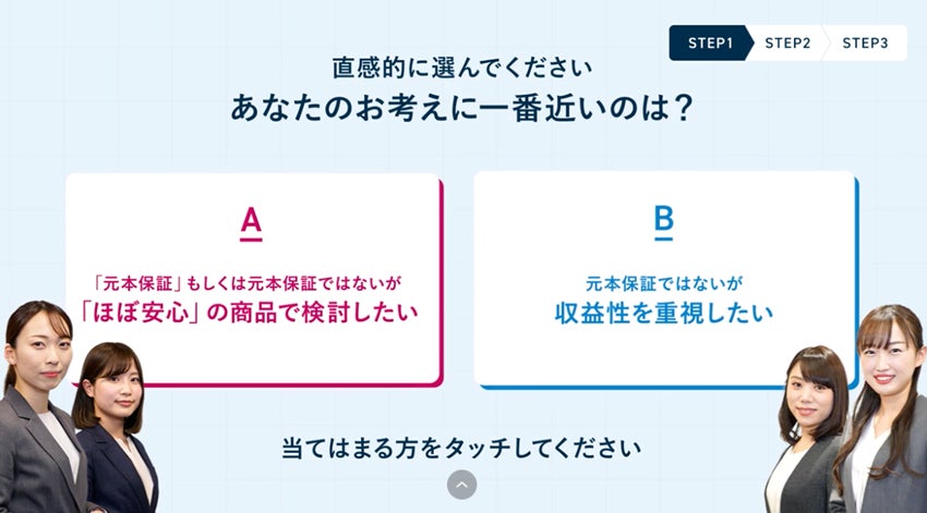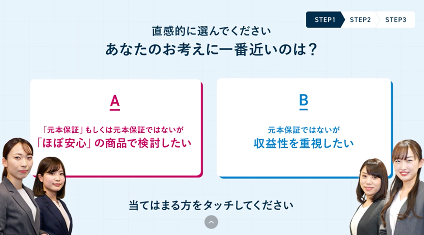 「インタラクティブ動画」のストーリー分岐機能を使って、お客さまはご自身の選択(タップ)から診断形式で、運用意向に近い金融商品を選ぶことができます。また、商品を購入したお客さまには、商品内容の確認としても動画を視聴いただいています。