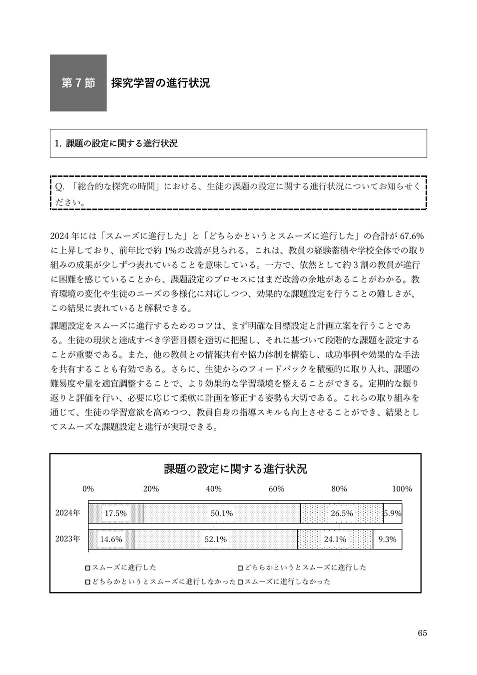 探究学習は、21世紀の社会を生きる子どもたちにとって不可欠な学びの形態として、近年ますます注目を集めています。急速に変化し続ける現代社会において、既存の知識を単に習得するだけでなく、自ら課題を発見し、解決策を模索する力が求められているのです。この「探究学習白書2024」は、日本の教育現場における探究学習の現状と課題、そして今後の展望を包括的にまとめた年次報告書です。本白書では、全国の高等学校における探究学習の実施状況を中心に調査し、分析しています。各教科での探究的な学びの展開から、「総合的な探究の時間」の評価方法まで、幅広い観点から探究学習の実態に迫ります。探究学習で取り扱われるテーマの傾向や、生徒の主体性・協働性の発揮状況、さらには教員の指導方法や評価の在り方など、多角的な視点から考察します。また、本書では探究学習を支援する外部団体の活用状況や、学習課題の設定方法、生徒の達成度など、具体的なデータに基づいた分析も行っています。これらの情報は、教育現場での探究学習の質的向上に寄与するものと確信しています。さらに、探究学習に関する最新動向や、高等学校での取り組み事例、大学入試における探究の採用状況など、時宜を得た情報も盛り込んでいます。加えて、探究学習を支援するプログラムや補助金制度についても詳しく解説し、教育現場での活用の一助となることを目指しています。中学校や高等学校、大学、教育委員会などの教育機関はもとより、教育産業を担う企業、研究機関などさまざまな教育関係者にとって、本白書が探究学習の意義と可能性を理解する上での貴重な資料となることを願っています。そして何より、この白書が日本の教育の質的向上に寄与し、未来を担う子どもたちの学びをより豊かなものにする一助となれば幸いです。
