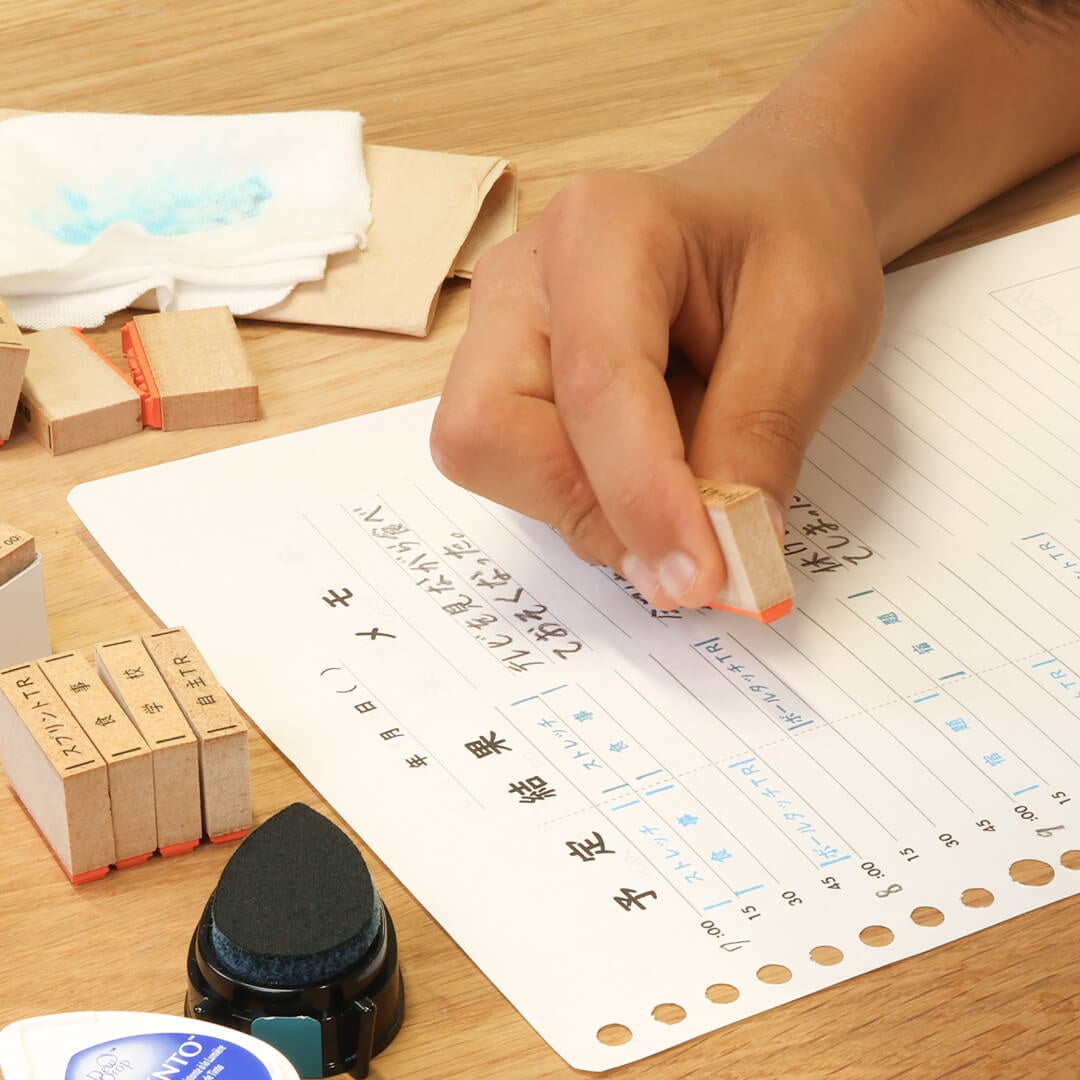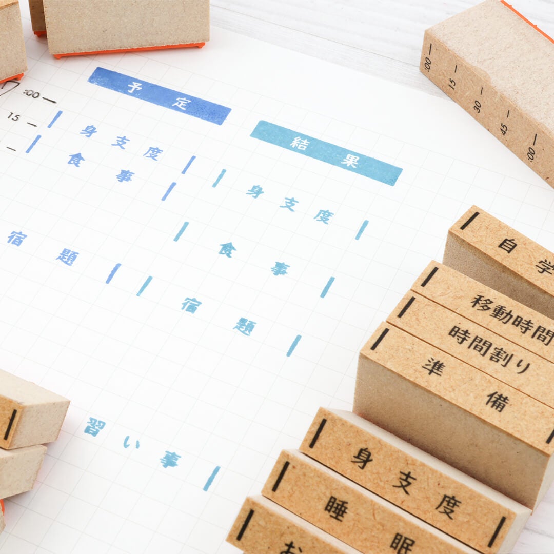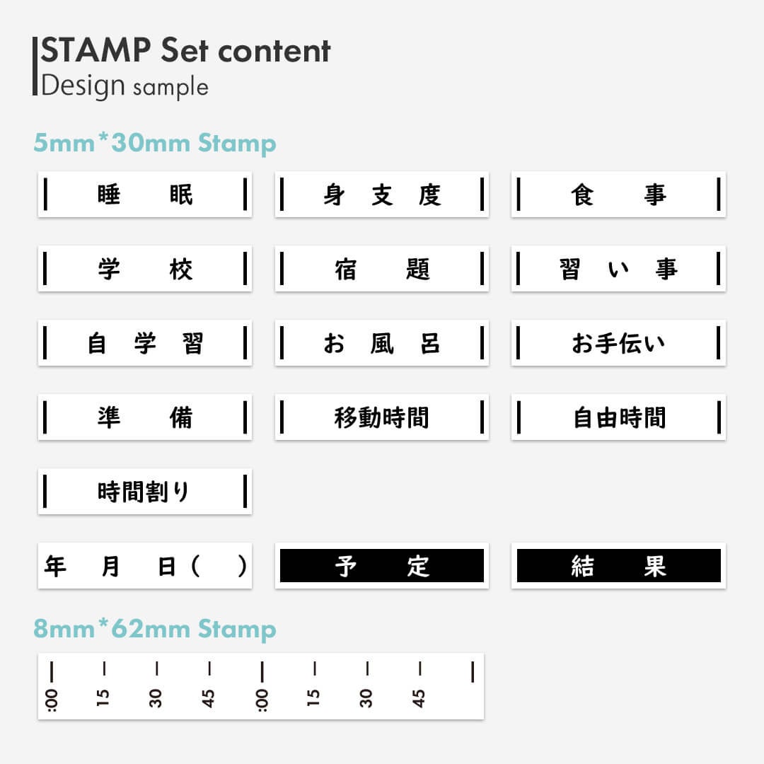内容を自由に決めて作れるスケジュールスタンプ16個、時間割りスタンプ1個がセットになったキットです。