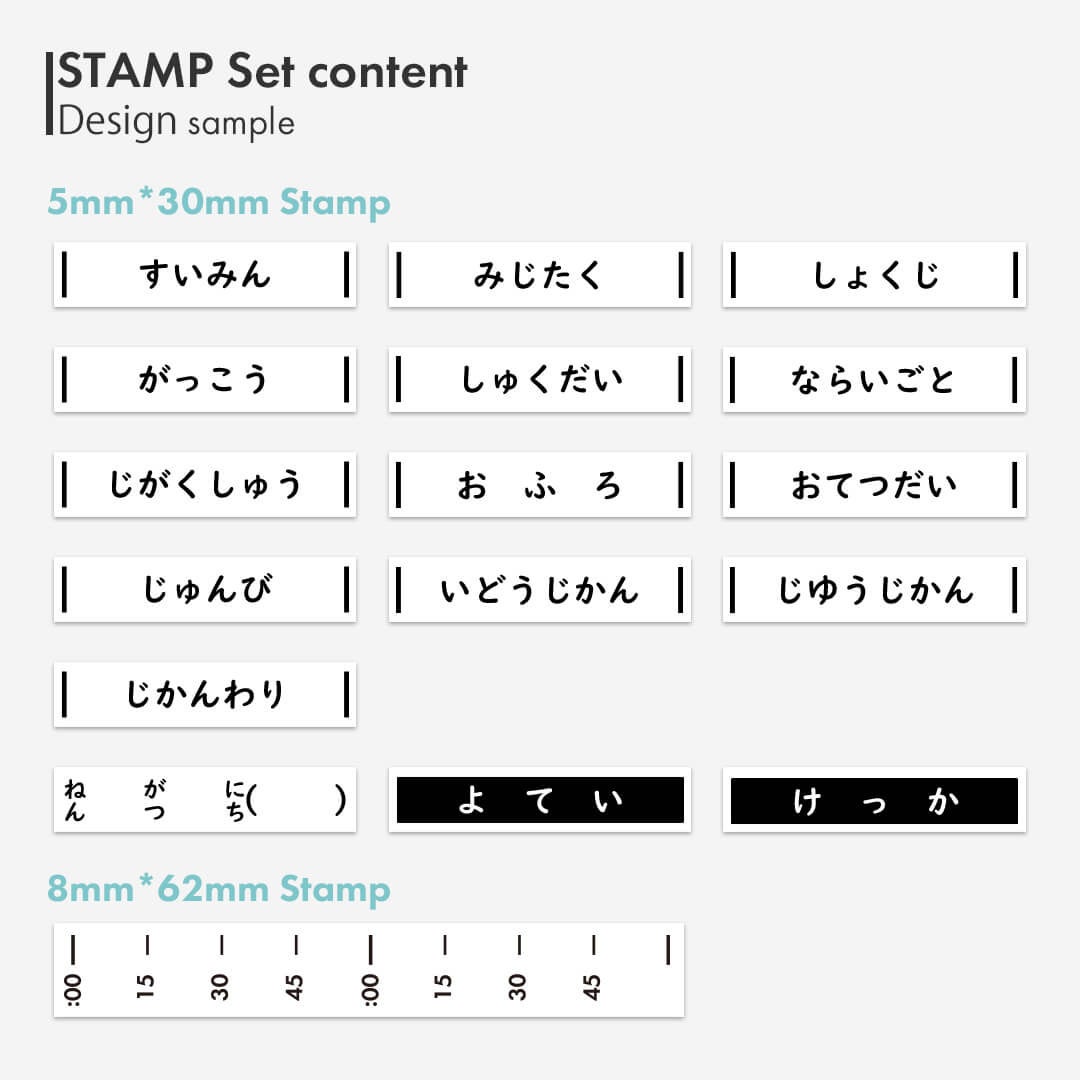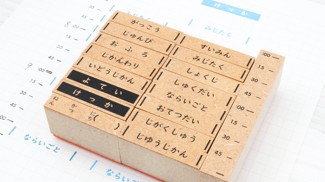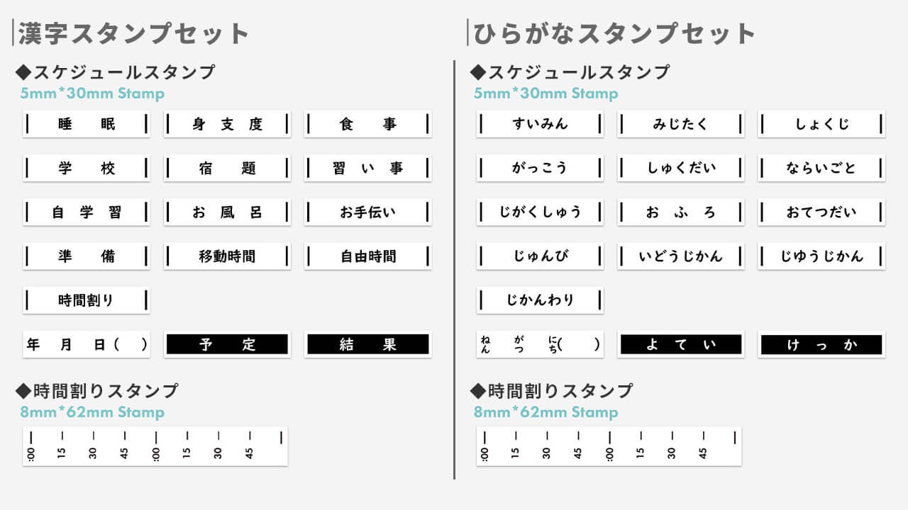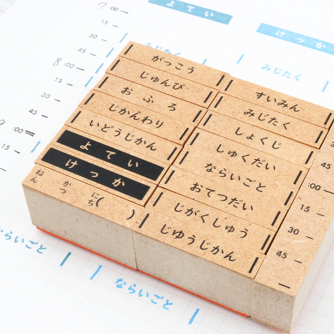 ひらがなの定型のスケジュールスタンプ16個、時間割りスタンプ1個がセットになったキットです。
