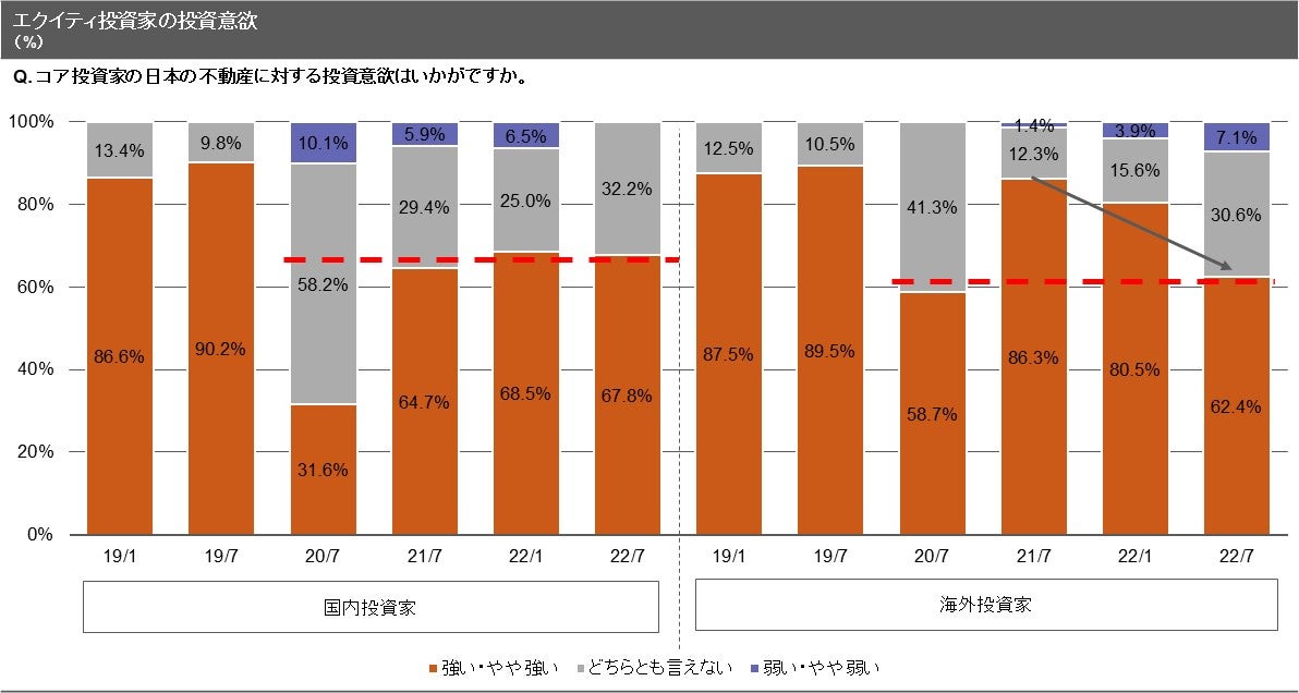 エクイティ投資家の投資意欲は、海外投資家において「どちらともいえない」「やや弱い」との回答割合が37.6%(前回調査19.5%)まで上昇しており、コロナ禍直後と変わらない水準となった。