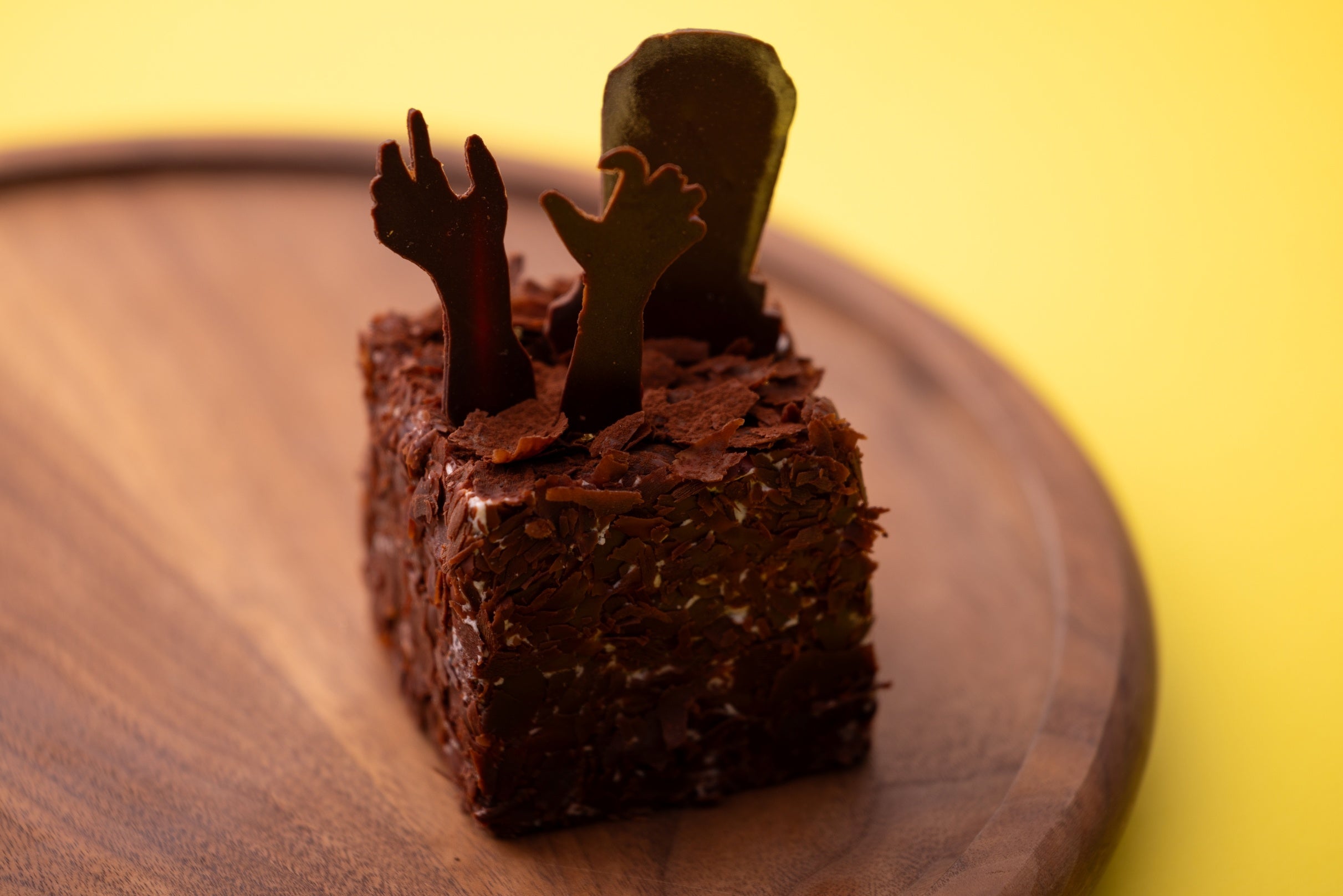 助けを求めるような手の飾りが印象的なチョコレートケーキ。ベルギー産のチョコレートとキルシュ(チェリー酒)を使用した、しっとり大人の味わいです。