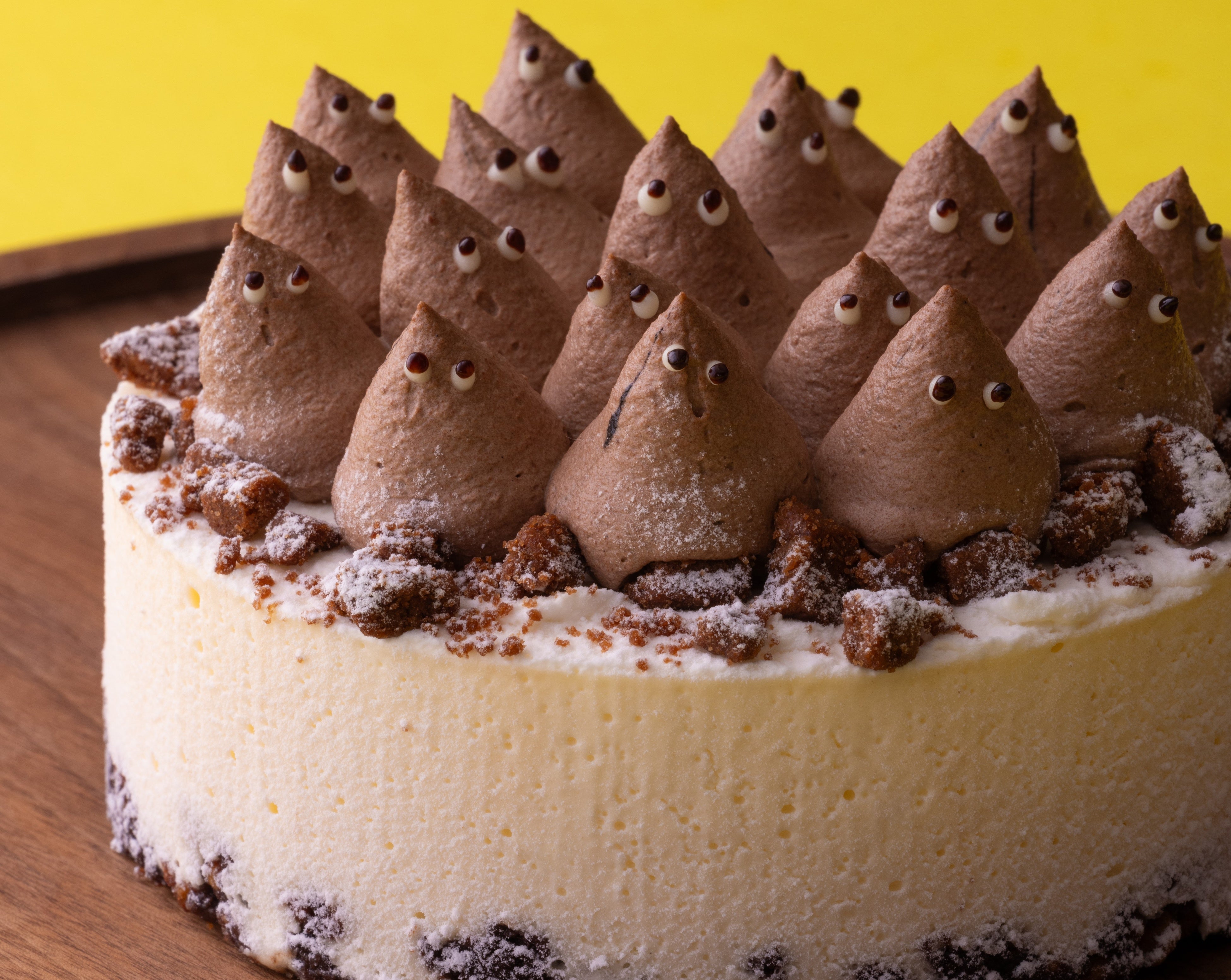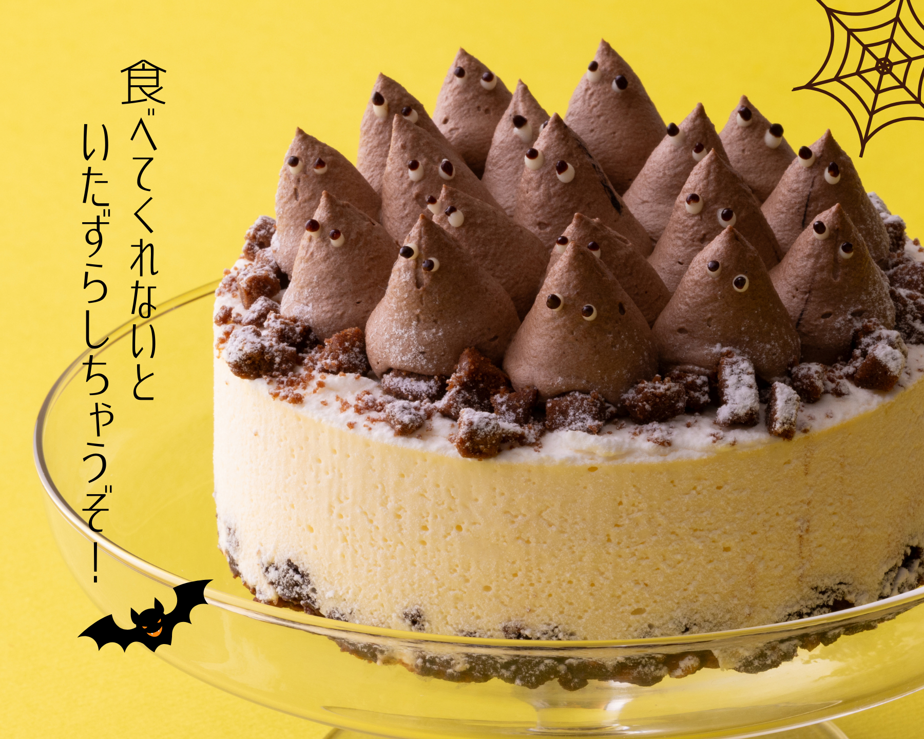 ケーキの箱を開けた瞬間、思わず「私、見られている!」と呟いてしまいそうなホールケーキ。レアチーズタイプのムースにチョコレートクッキーとナッツを散りばめて、チョコレートクリームで愛らしい幽霊たちを並べました。