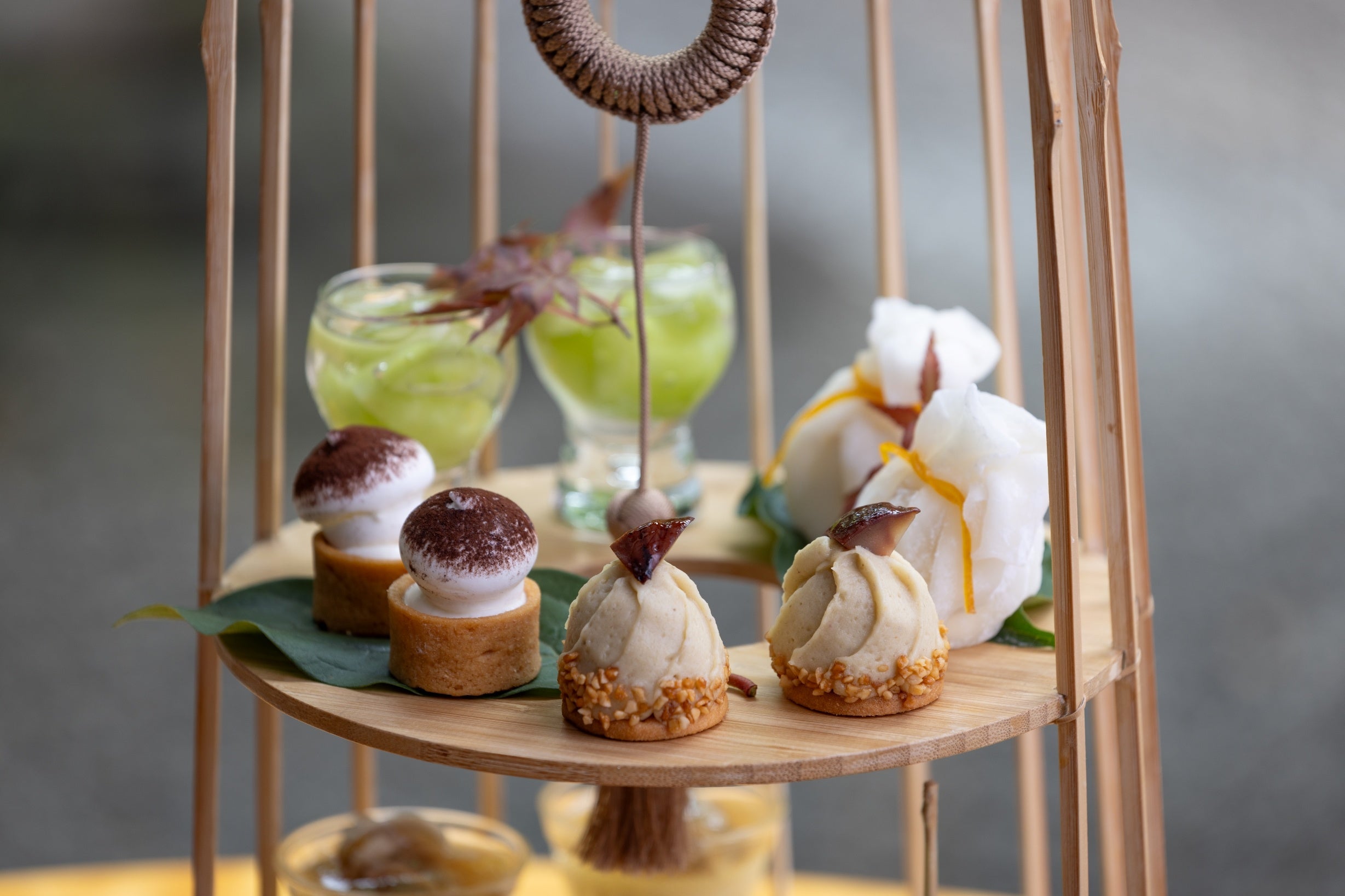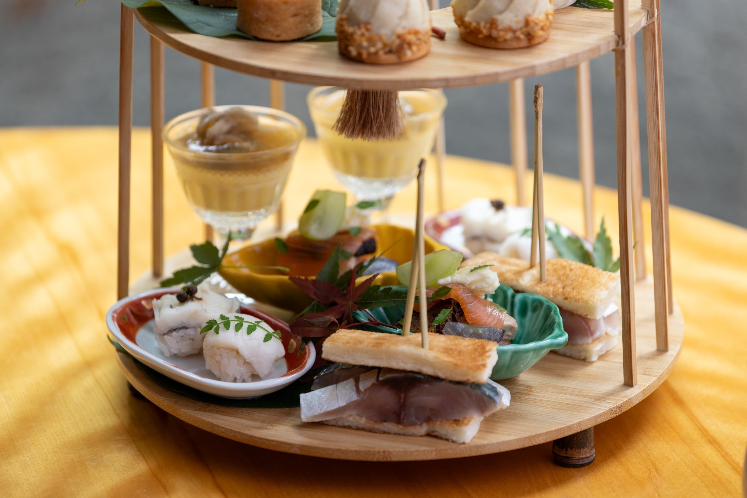 日本料理のエッセンスを取り入れたセイボリーは、個性的な組み合わせを上品に仕上げた「秋鯖生寿司サンドウィッチ 柴漬けタルタル」や、丁寧に引いただしが味わい深い「胡麻豆腐玉〆きのこ餡掛け」などがラインナップ。