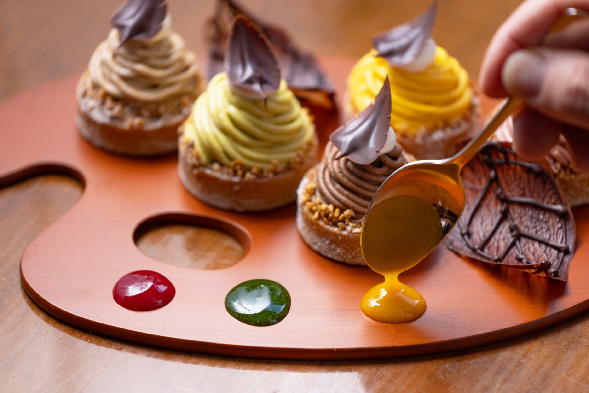 栗だけでなく、フルーツやチーズを組み合わせた個性あふれる5種類のモンブランを、パレット型のプレートに盛り付けます。さらに、絵の具に見立てた3色のカラフルなソースを添えてお出しします。自分だけの絵を描くように、ソースをパレットに広げてお楽しみください。5種類のモンブランを食べ比べていただけるように、このメニュー限定で通常より一回り小さなサイズでご用意します。ドリンクは、コーヒーと紅茶をおかわり自由でお楽しみください。