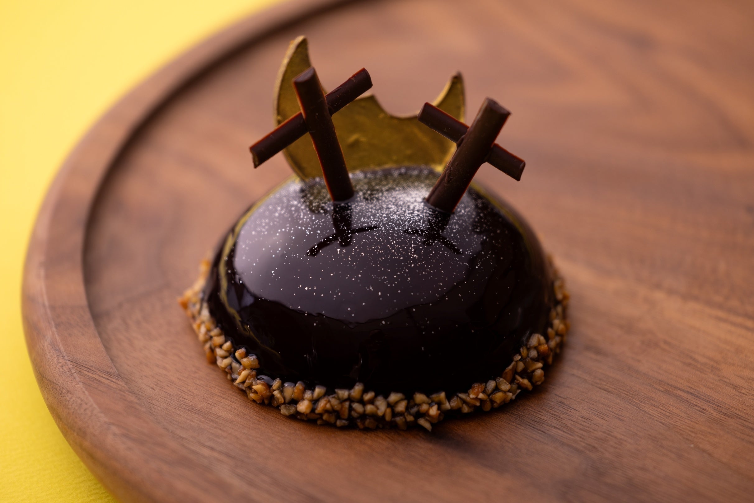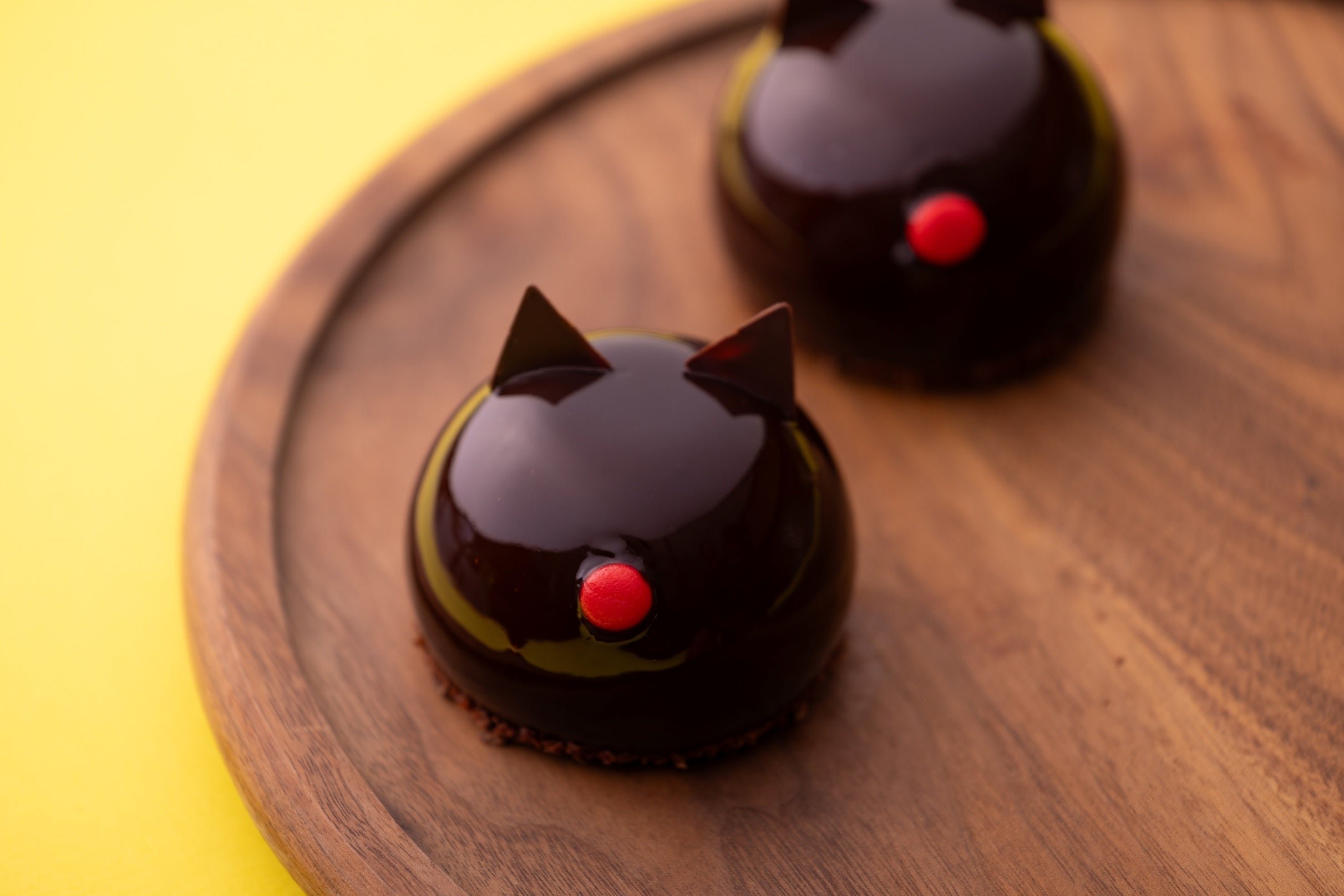 真っ赤なお鼻がキュートな黒猫ムースケーキは、和のテイスト。栗のムースに、小豆やほうじ茶チョコレートをあしらい、白味噌風味のカラメルムースで包みました。チョコレートのグラサージュで仕上げた、艶々まん丸なお顔に笑みがこぼれます。