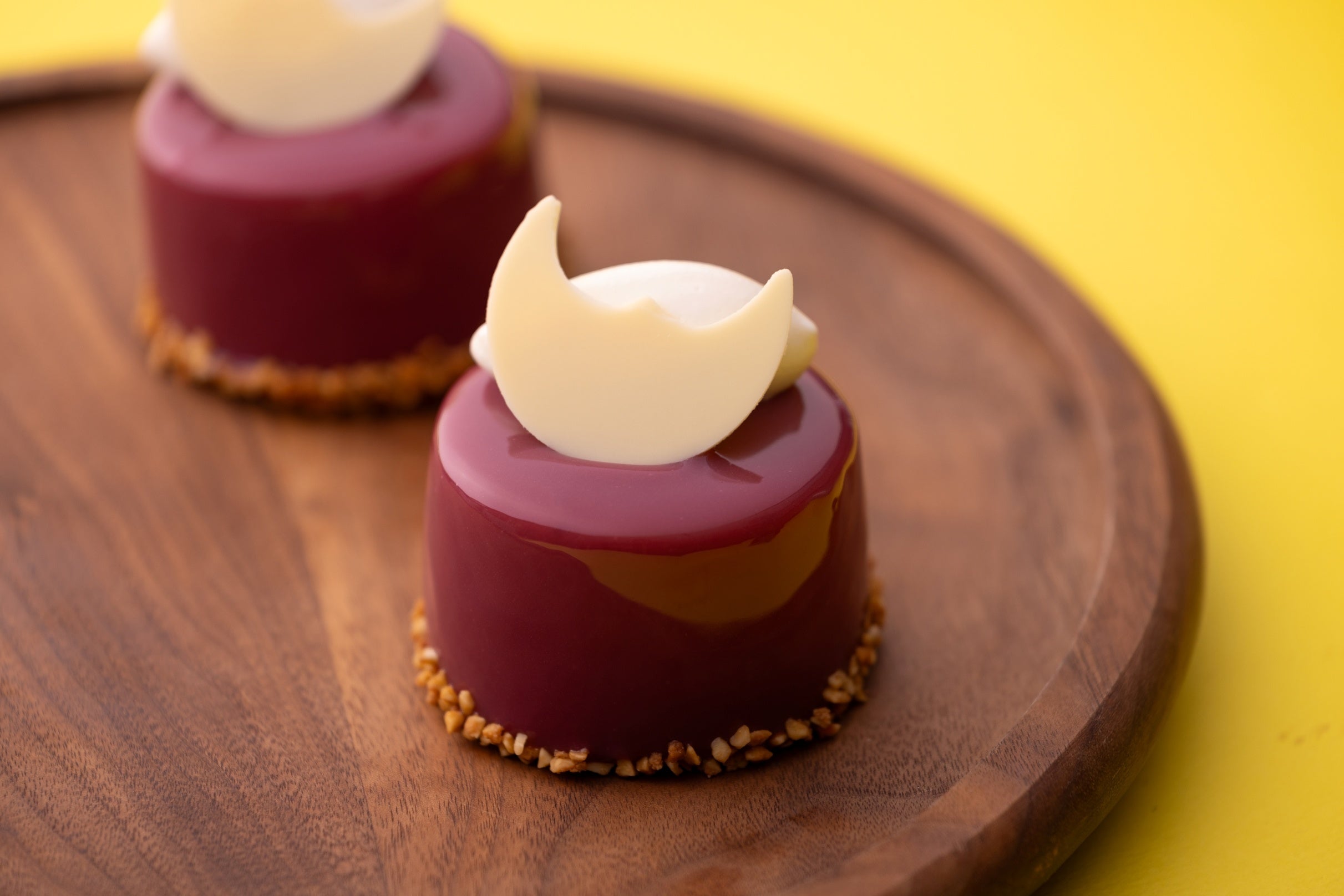セミドライいちじくを赤ワインで煮込み、チョコレートムースと合わせました。赤ワインをイメージした、ほんのりダークな赤色グラサージュで仕上げた上品なケーキです。