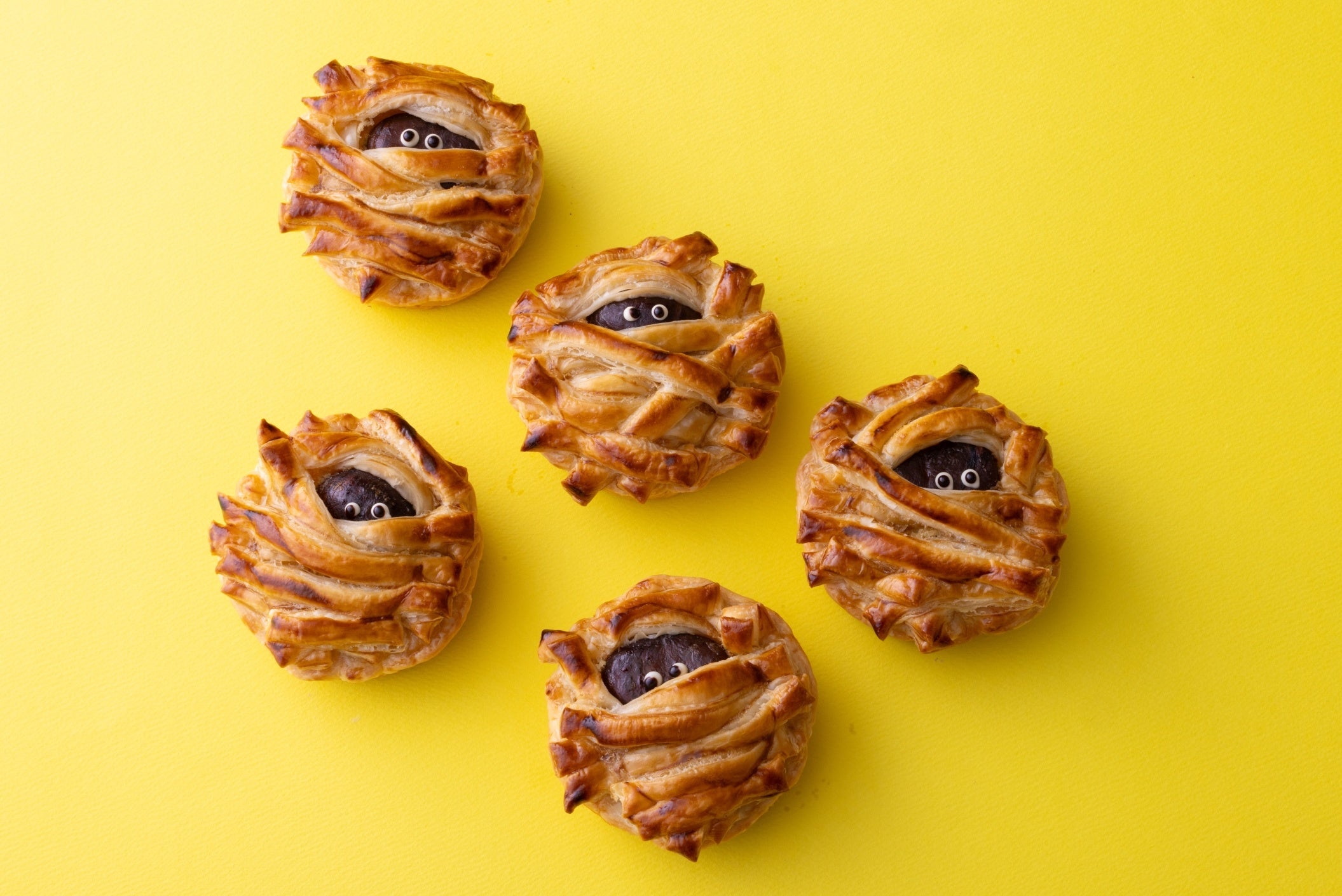何だか動き出しそうに思えてくる可愛いお目めのミイラパイ。和栗ペーストとアーモンドを合わせた、まろやかなクリームをパイ生地で包んで焼き上げました。パイから覗くミイラの顔は、栗の渋皮煮を使っています。