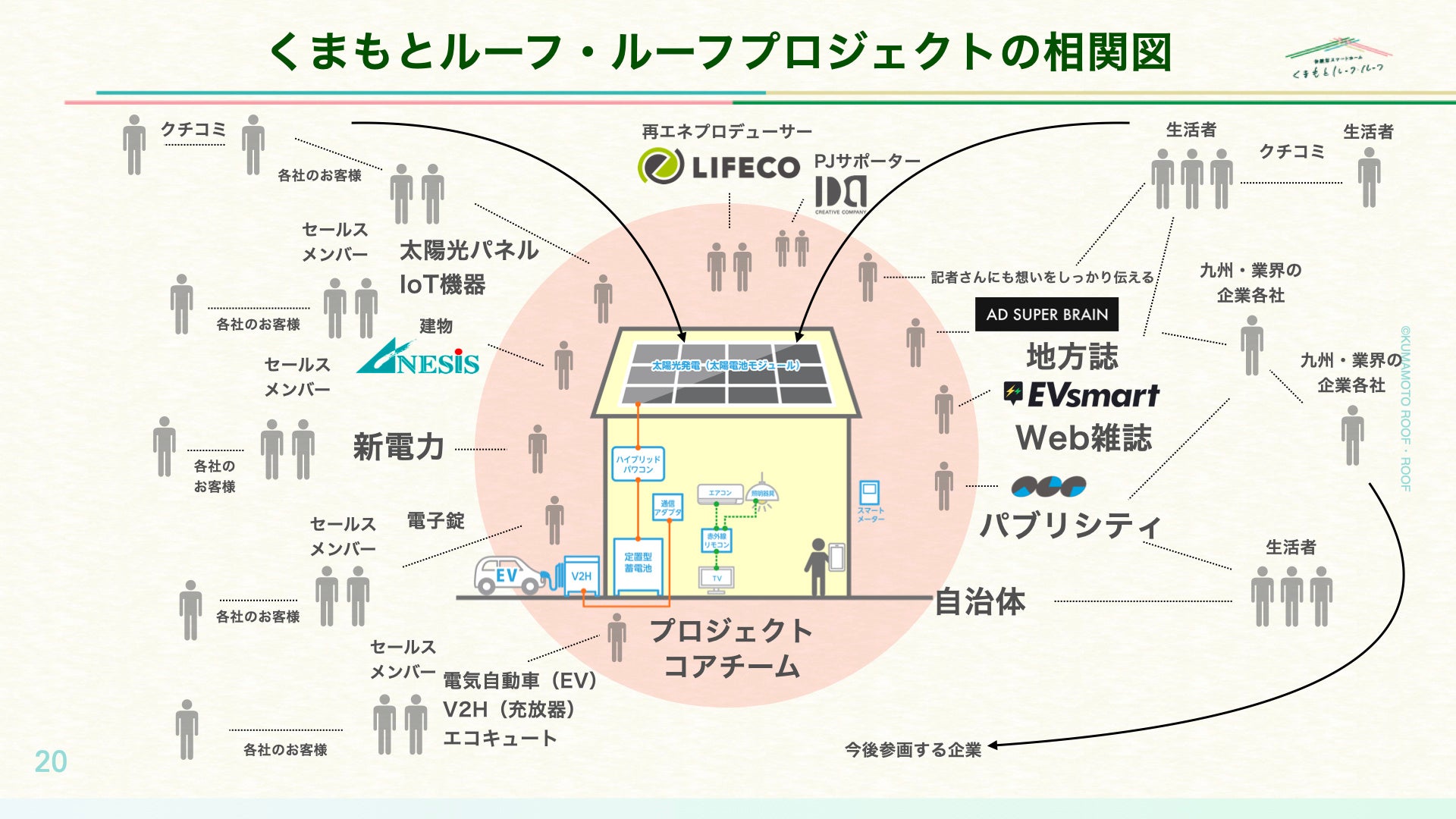 本プロジェクトでは、住宅の建設を担当する企業様、太陽光発電や蓄電池、V2Hなどの再エネ設備を担当する企業様、照明を担当する企業様、EVを担当する企業様、IoT家電を担当する企業様、全体企画・プロモーションを担当する企業様、イベント企画を担当する企業様など、多くのステークホルダーとプロジェクトチームを結成して進行しています。プロジェクトチームは月に1回のプロジェクト進捗Web会議やウェビナーの開催、最新の再エネに関する情報交換など実施しています。現在、10社を超える企業様とプロジェクト運営をしており、参画企業様は徐々に増えています。今後も多くの参画企業と連携をしていきたいと考えていますので、ご興味のある企業様はご連絡いただければ幸いです。
