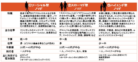 本レポートにおいて、デジタルノマドの特徴的なタイプを以下3分類に整理。一般的に①をイメージするが、潜在ニーズとしては②③のポテンシャルも高い