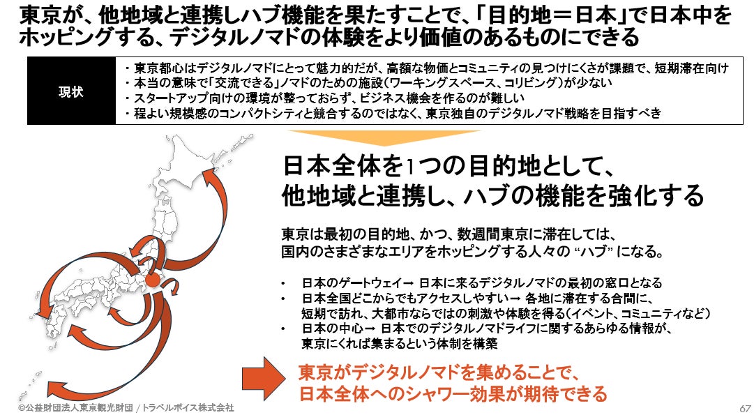 本研究を通じて、東京が、他地域と連携しハブ機能を果たすことで、「目的地=日本」となり、日本中をホッピングすることでデジタルノマドの体験をより価値あるものにできると明らかになりました。ハブ機能を強化させるための3つのポイントは以下の通りです。
