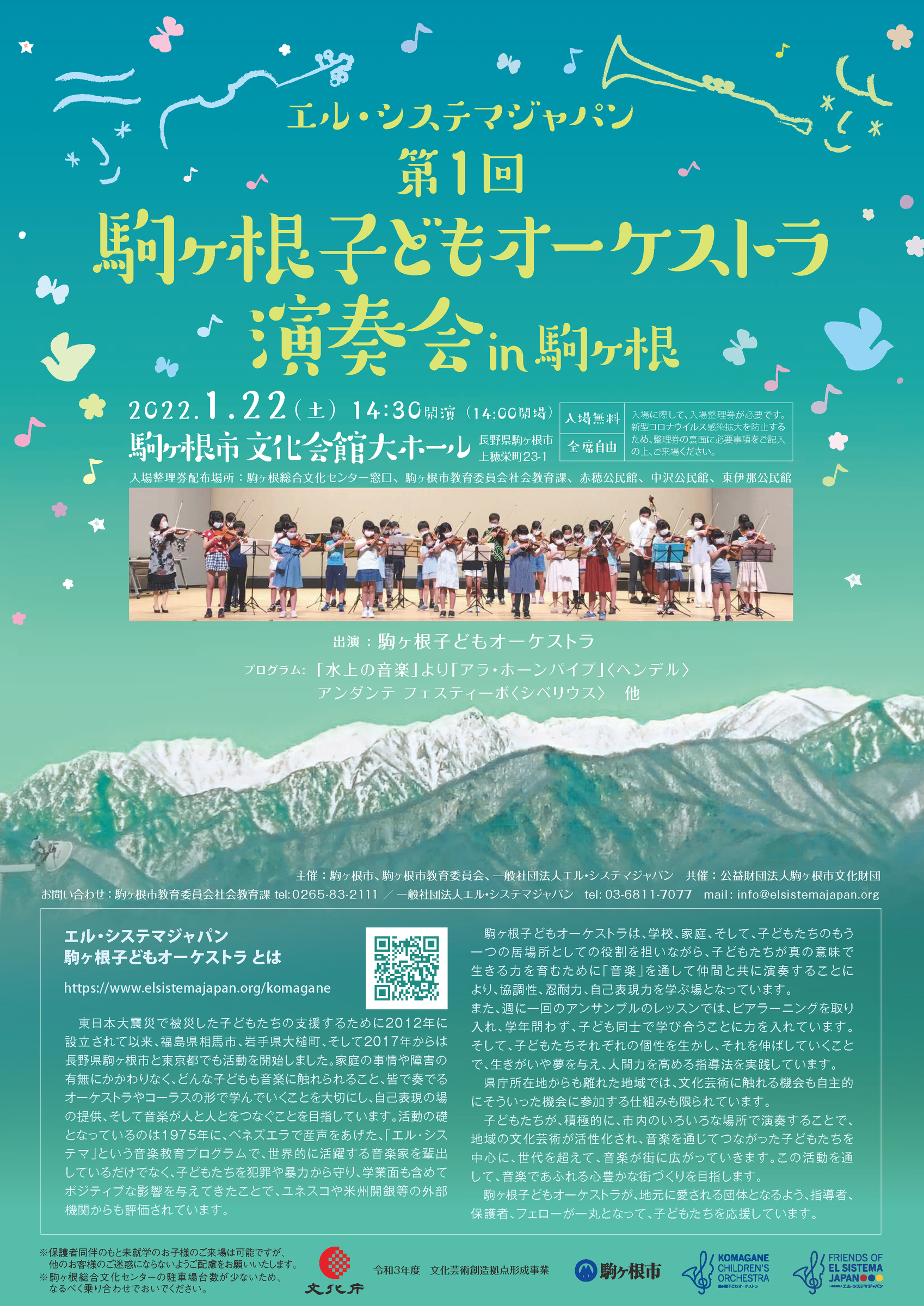 | 日時 2022年1月22日(土)開場 14時00分 開演 14時30分 会場 駒ヶ根文化会館 大ホール (〒399-4115 長野県駒ヶ根市上穂栄町23-1) 出演 駒ヶ根子どもオーケストラ プログラム: 「 水上の音楽」より「アラ・ホーンパイプ」〈ヘンデル〉 アンダンテ フェスティーボ〈シベリウス〉 他 チケット 入場無料・自由席 入場に際して、入場整理券が必要です。新型コロナウイルス感染拡大を防止するため、整理券の裏面に必要事項をご記入の上、ご来場ください。 入場整理券配布場所 : 駒ヶ根総合文化センター窓口、 駒ヶ根市教育委員会社会教育課、 赤穂公民館、 中沢公民館、 東伊那公民館 ※保護者同伴のもと未就学のお子様のご来場は可能ですが、他のお客様のご迷惑にならないようご配慮をお願いいたします ※駒ヶ根総合文化センターの駐車場台数が少ないため、なるべく乗り合わせでおいでください。 主催 駒ヶ根市、駒ヶ根市教育委員会、一般社団法人エル・システマジャパン 共催 公益財団法人駒ヶ根市文化財団 問合せ 駒ヶ根市教育委員会社会教育課 tel: 0265-83-2111 一般社団法人エル・システマジャパン tel : 03-6811-7077 mail : info@elsistemajapan.org |