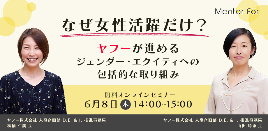 本セミナーでは、ヤフー株式会社でD.E. & I. および「gender equity(男女公正)」を推進されている担当者2名に、これまでの取り組みや推進の現場で直面する課題やそこへの対応策、見えてきた普遍的なポイントなどをお話いただきます。