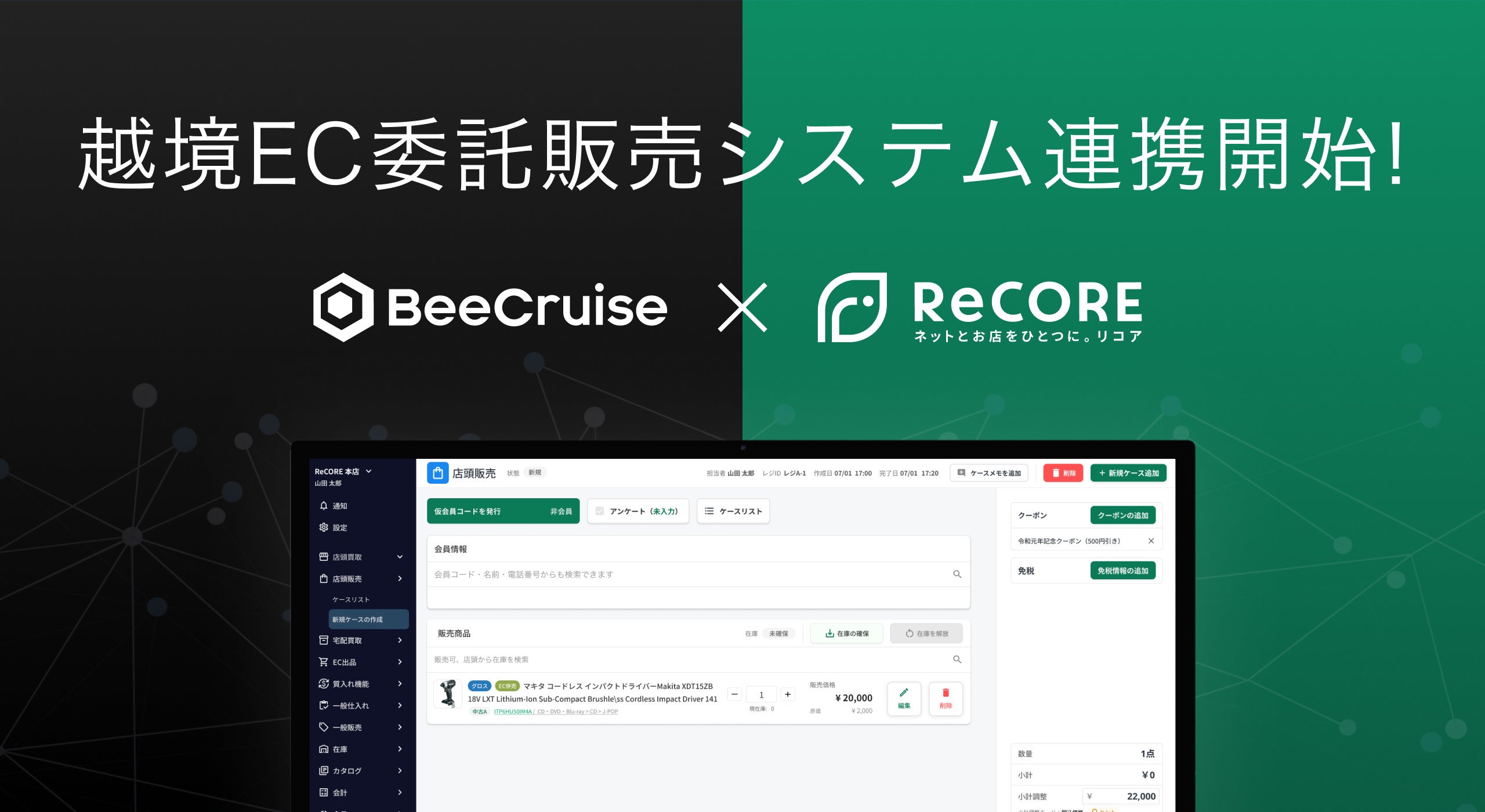 今回、当社の提供する小売・リユース業専門クラウドPOSレジ「ReCORE(リコア)」(以下、ReCORE)とBeeCruiseとの提携により、それらの課題が解決されるサービスを提供することが可能になります。