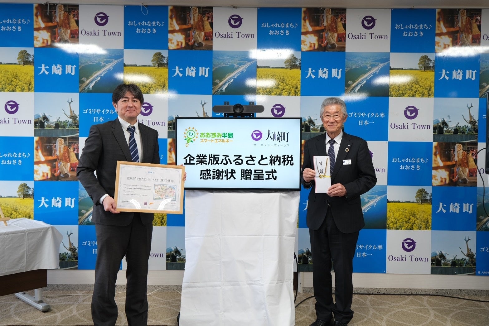 おおすみ半島スマートエネルギー株式会社様には,企業版ふるさと納税の寄附先として大崎町を選定いただいたことに対しまして,心から感謝申し上げます。